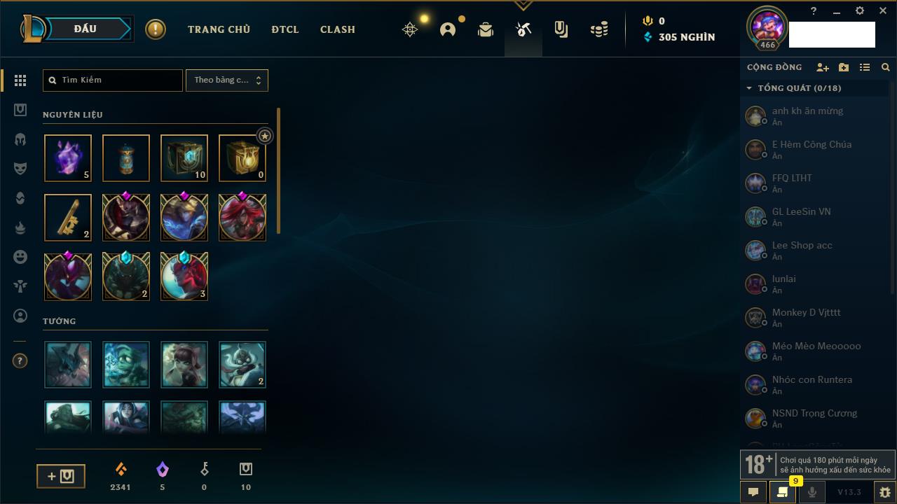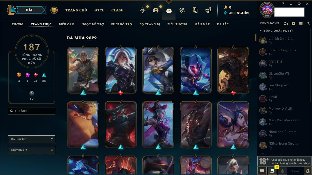 Rank Đơn: Vàng IIIKhung: BạcTướng: 171 - Còn 101359 THXTrang Phục: 88Rank ĐTCL: Kim Cương IVLinh Thú: 200
