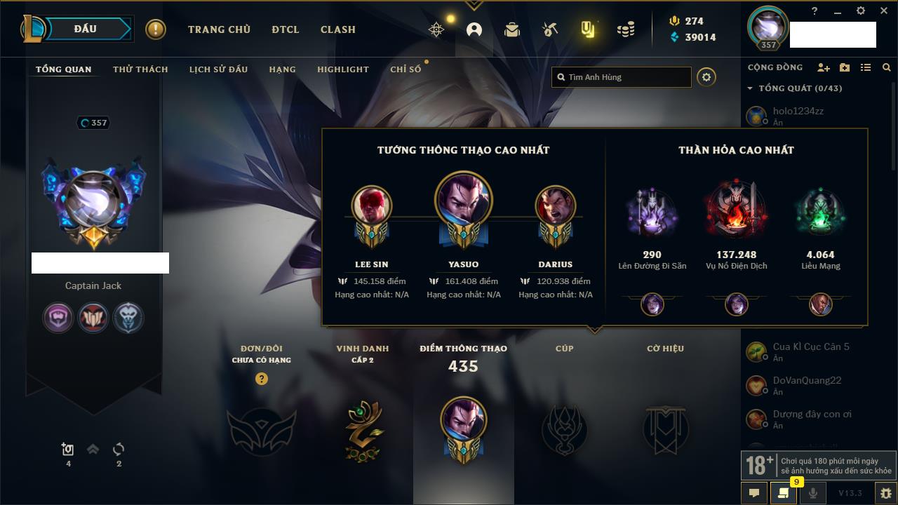 Rank Đơn: Bạch Kim IIKhung: Bạch kimTướng: 171 - Còn 316137 THXTrang Phục: 89Rank ĐTCL: Bạch Kim IIILinh Thú: 94
