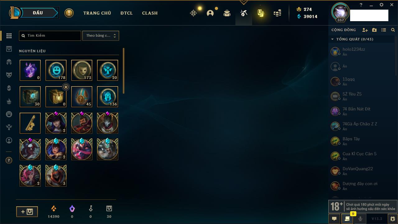 Rank Đơn: Lục Bảo IVKhung: VàngTướng: 171 - Còn 154648 THXTrang Phục: 203Rank ĐTCL: Bạch Kim IVLinh Thú: 69