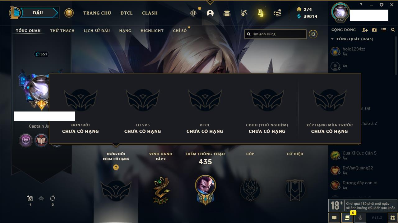 Rank Đơn: Vàng IIIKhung: VàngTướng: 172 - Còn 164704 THXTrang Phục: 255Rank ĐTCL: Kim Cương IVLinh Thú: 156