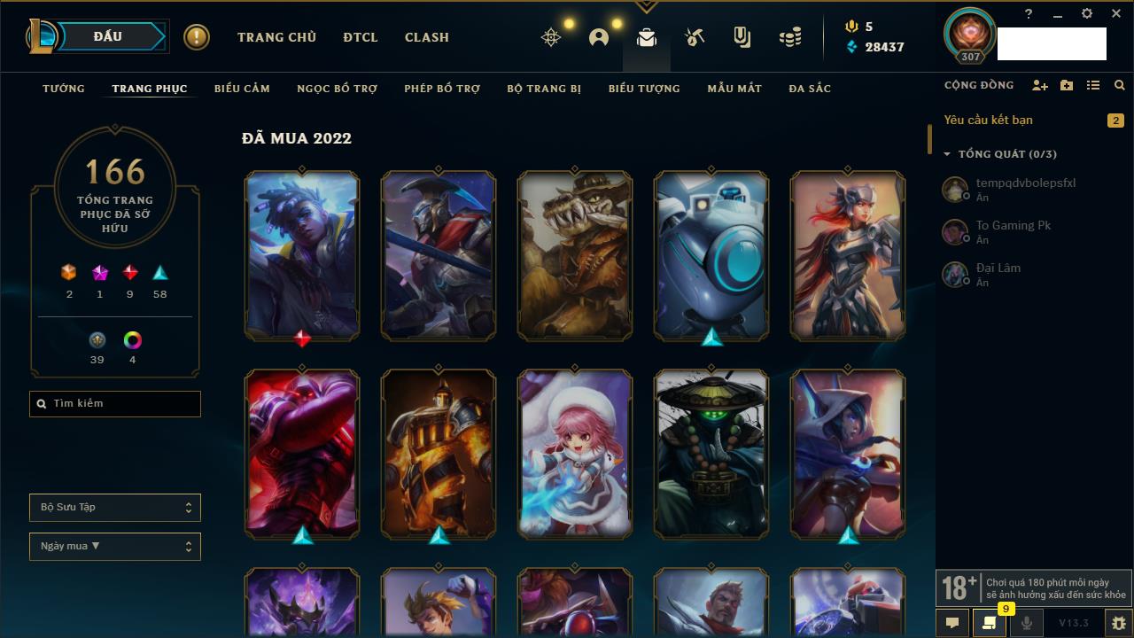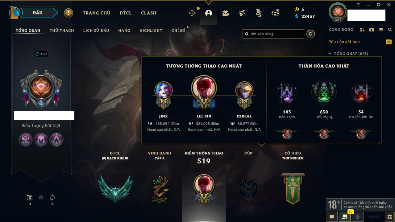 Rank Đơn: Bạc IIIKhung: BạcTướng: 168 - Còn 101710 THXTrang Phục: 184Rank ĐTCL: Chưa RankLinh Thú: 17