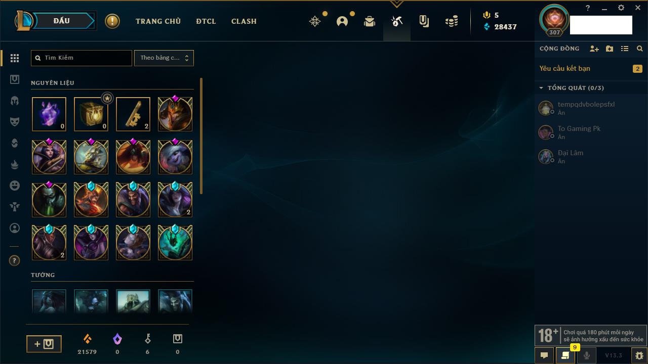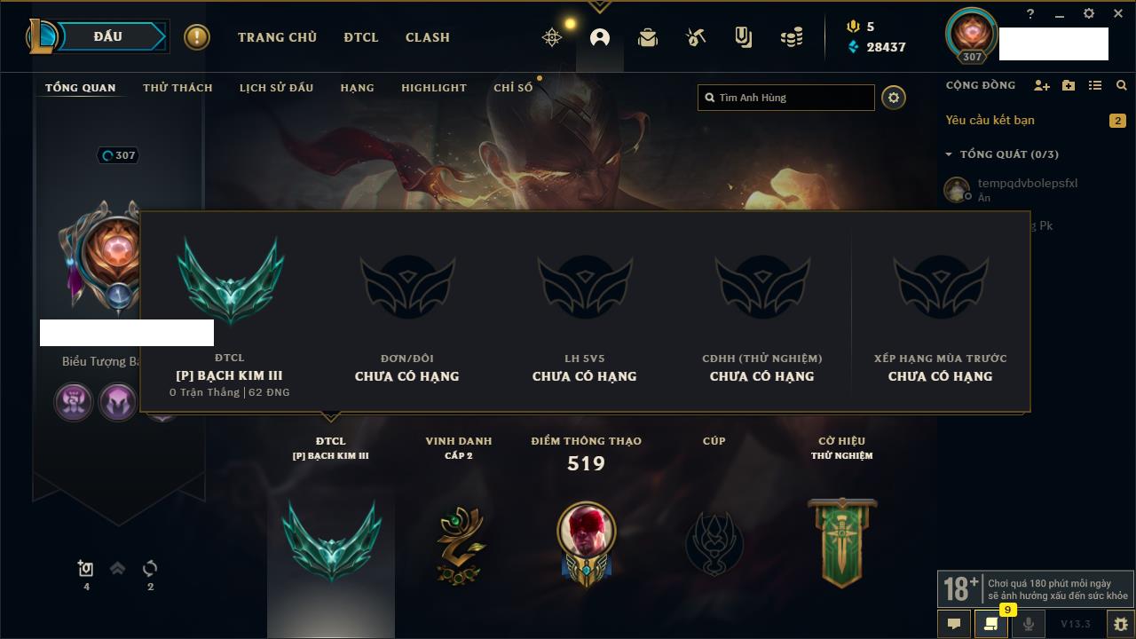 Rank Đơn: Bạc IVKhung: BạcTướng: 171 - Còn 102637 THXTrang Phục: 169Rank ĐTCL: Vàng IILinh Thú: 127