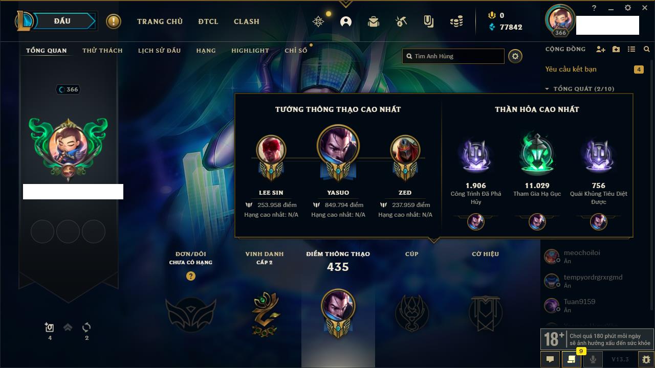 Rank Đơn: Lục Bảo IVKhung: Bạch kimTướng: 171 - Còn 128452 THXTrang Phục: 193Rank ĐTCL: Bạc IIILinh Thú: 100