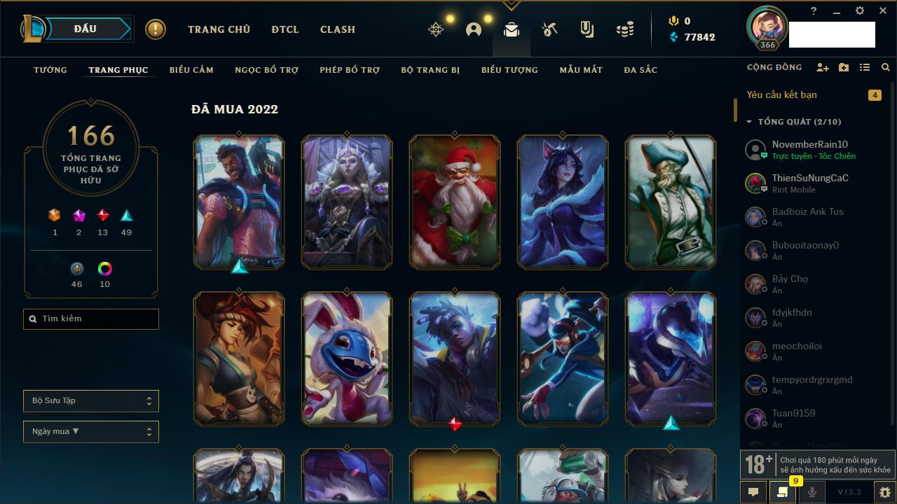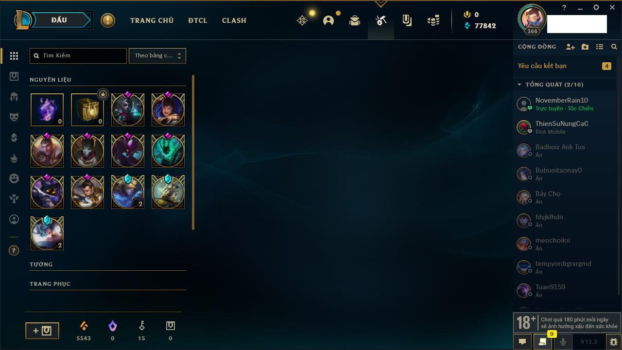 Rank Đơn: Vàng IIIKhung: BạcTướng: 171 - Còn 101359 THXTrang Phục: 88Rank ĐTCL: Kim Cương IVLinh Thú: 200