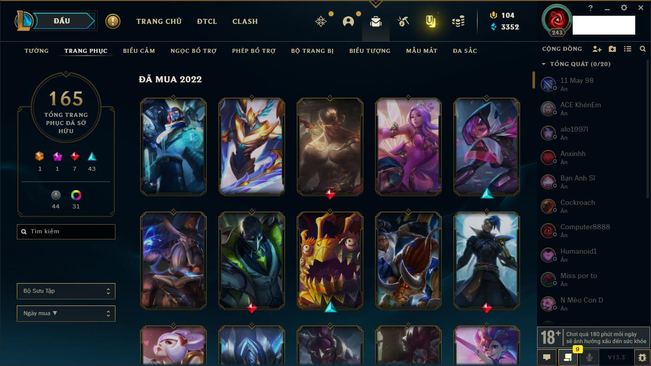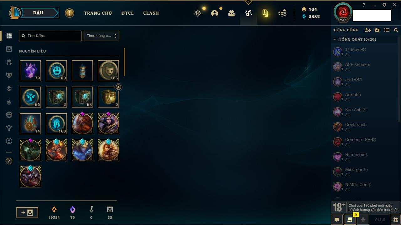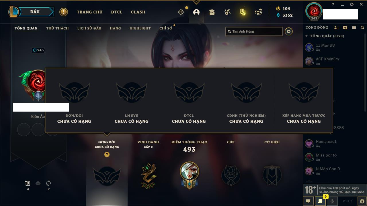 Rank Đơn: Vàng IIIKhung: BạcTướng: 171 - Còn 101359 THXTrang Phục: 88Rank ĐTCL: Kim Cương IVLinh Thú: 200