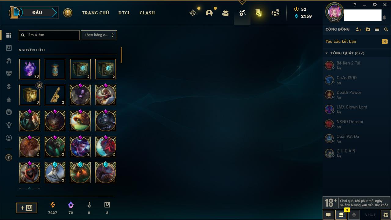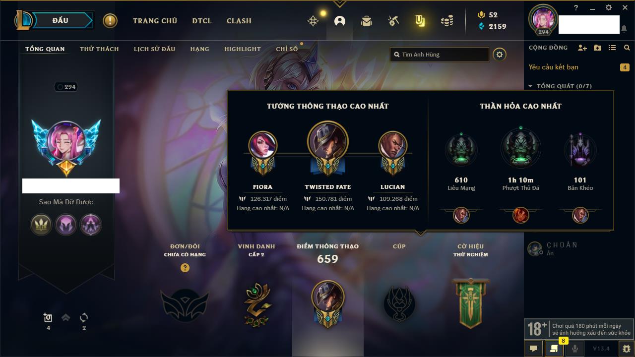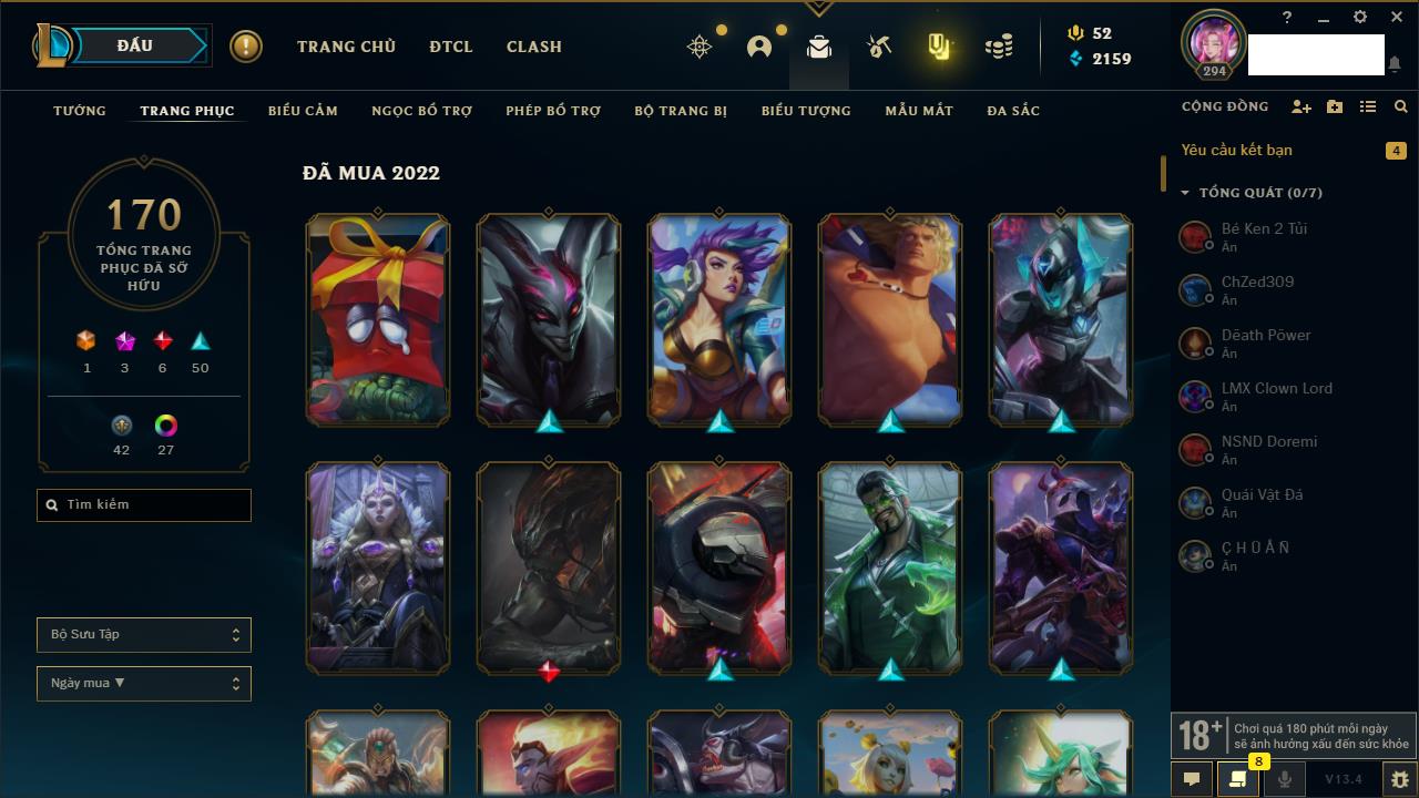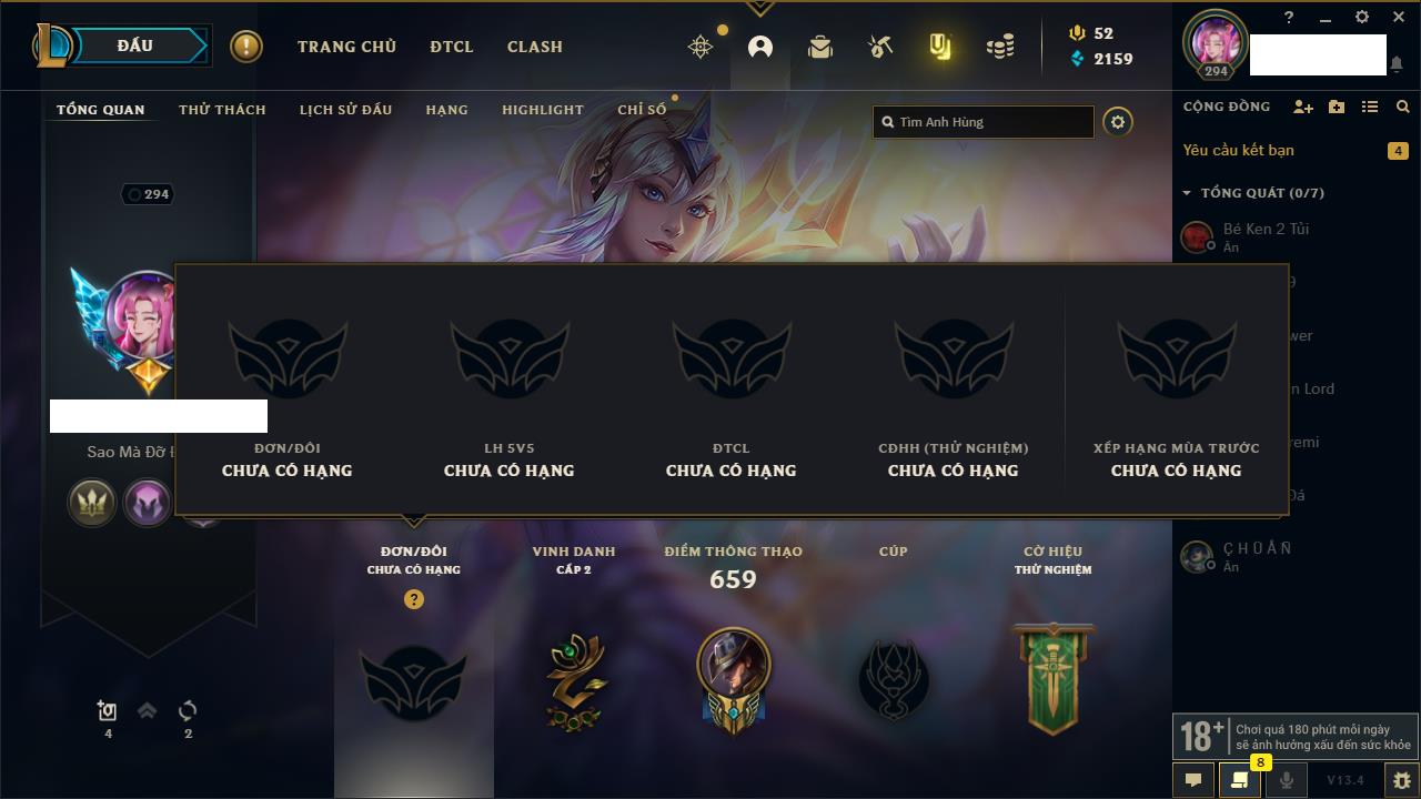 Rank Đơn: Đồng IIKhung: Chưa có khungTướng: 170 - Còn 56487 THXTrang Phục: 90Rank ĐTCL: Chưa RankLinh Thú: 129