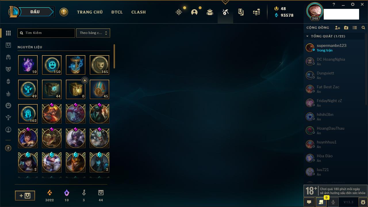 Rank Đơn: Vàng IVKhung: BạcTướng: 171 - Còn 426239 THXTrang Phục: 162Rank ĐTCL: Chưa RankLinh Thú: 33
