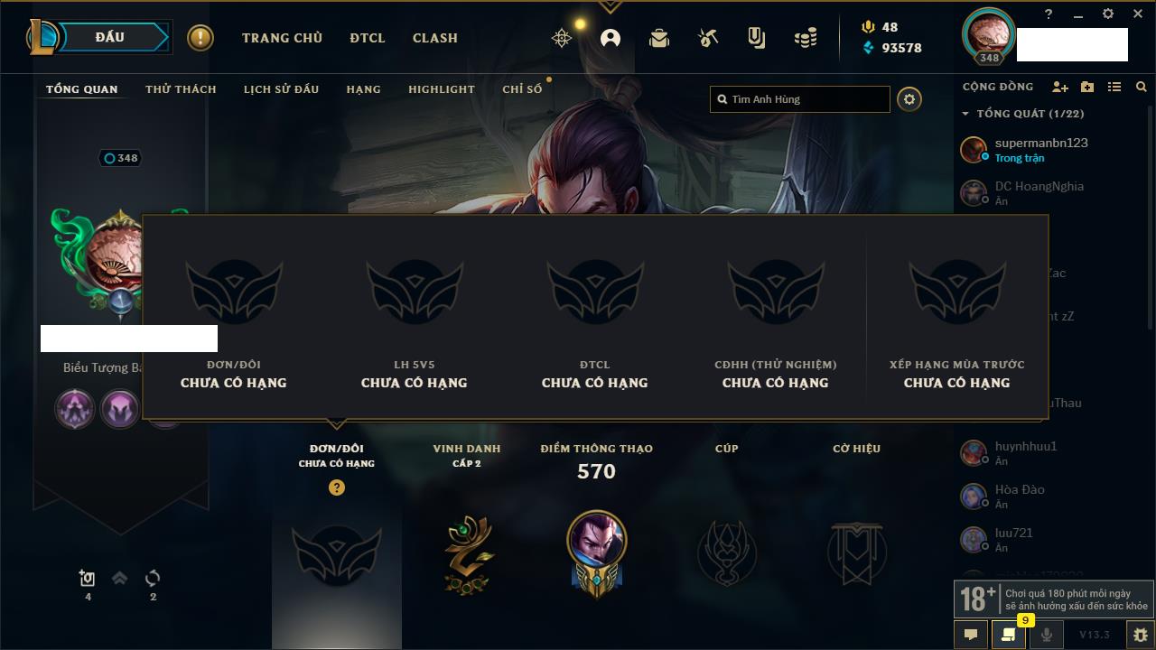 Rank Đơn: Bạc IIKhung: VàngTướng: 171 - Còn 332462 THXTrang Phục: 165Rank ĐTCL: Kim Cương IVLinh Thú: 181