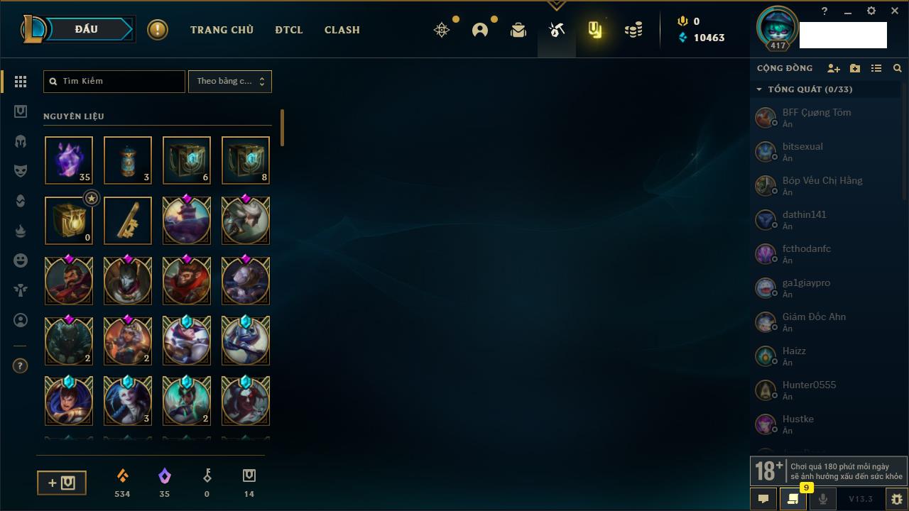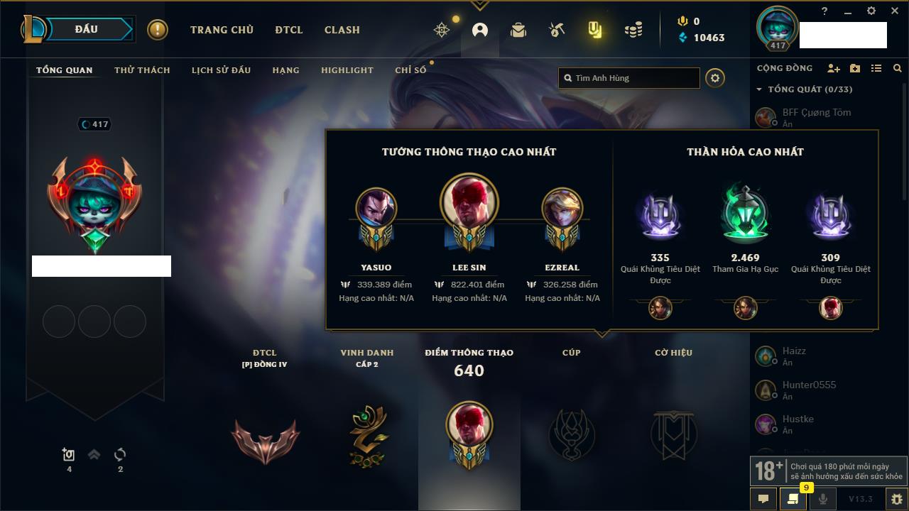 Rank Đơn: Đồng IIKhung: Chưa có khungTướng: 170 - Còn 56487 THXTrang Phục: 90Rank ĐTCL: Chưa RankLinh Thú: 129
