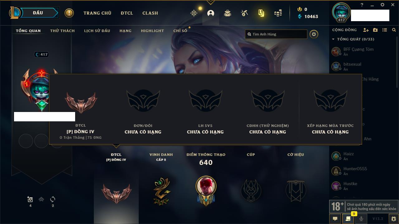 Rank Đơn: Vàng IVKhung: VàngTướng: 146 - Còn 89110 THXTrang Phục: 63Rank ĐTCL: Vàng IIILinh Thú: 41