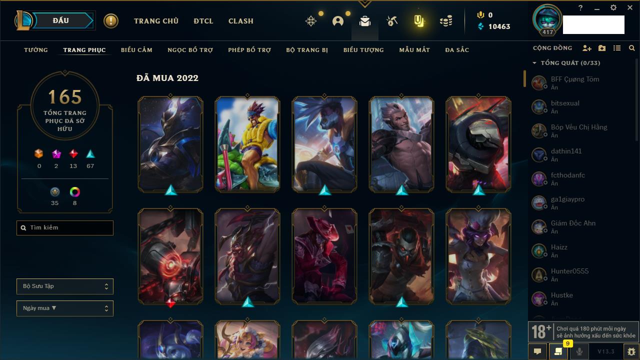 Rank Đơn: Vàng IIIKhung: VàngTướng: 170 - Còn 33222 THXTrang Phục: 136Rank ĐTCL: Chưa RankLinh Thú: 40