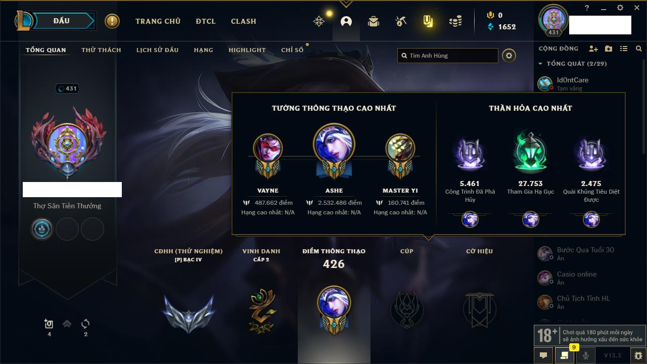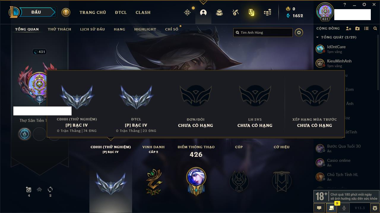 Rank Đơn: Bạch Kim IVKhung: Bạch kimTướng: 172 - Còn 326966 THXTrang Phục: 234Rank ĐTCL: Kim Cương IVLinh Thú: 167