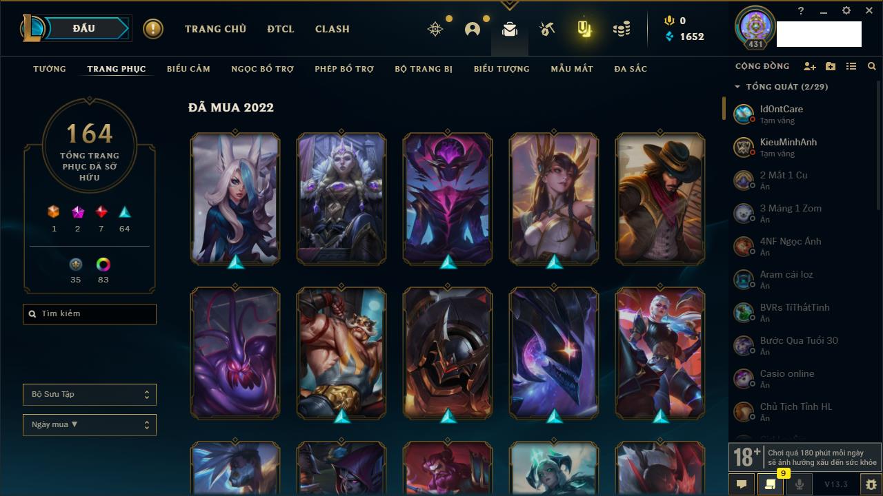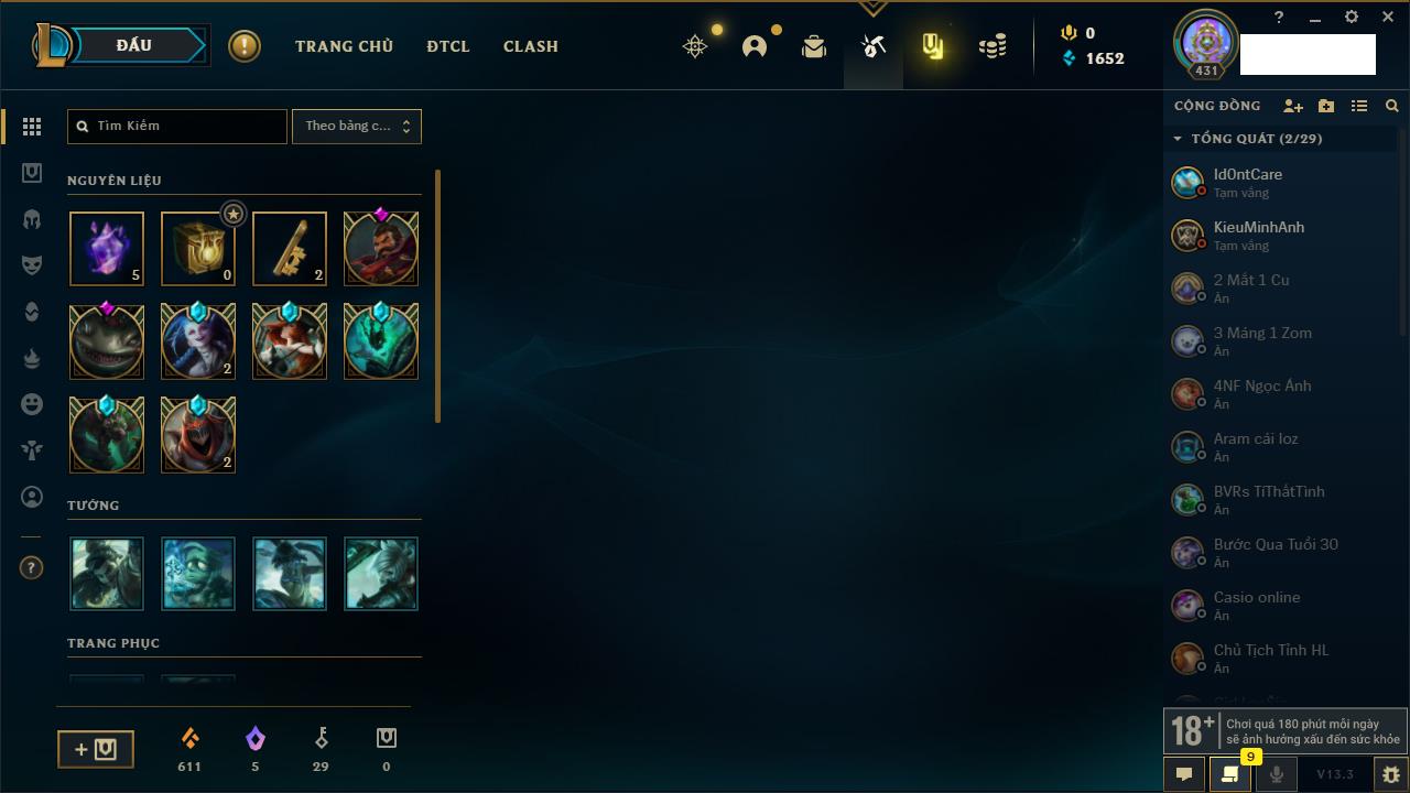 Rank Đơn: Chưa RankKhung: Chưa có khungTướng: 169 - Còn 43188 THXTrang Phục: 205Rank ĐTCL: Chưa RankLinh Thú: 259