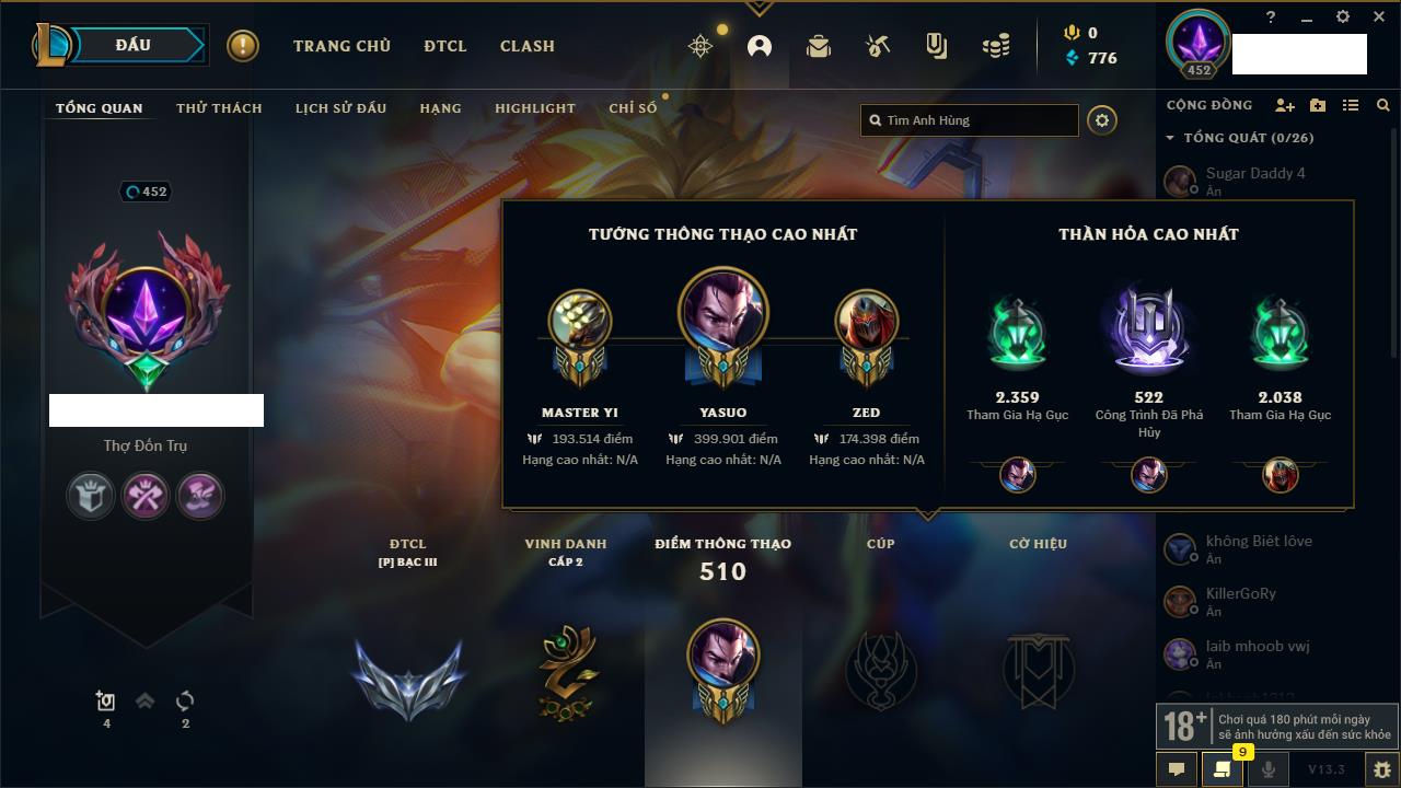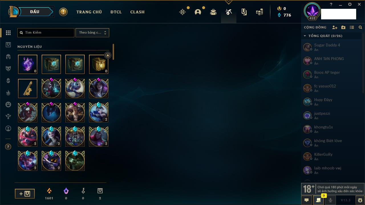 Rank Đơn: Đồng IIKhung: Chưa có khungTướng: 170 - Còn 56487 THXTrang Phục: 90Rank ĐTCL: Chưa RankLinh Thú: 129
