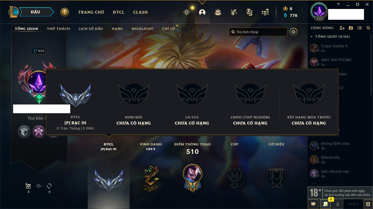 Rank Đơn: Đồng IIIKhung: ĐồngTướng: 171 - Còn 54778 THXTrang Phục: 96Rank ĐTCL: Bạch Kim IIILinh Thú: 140