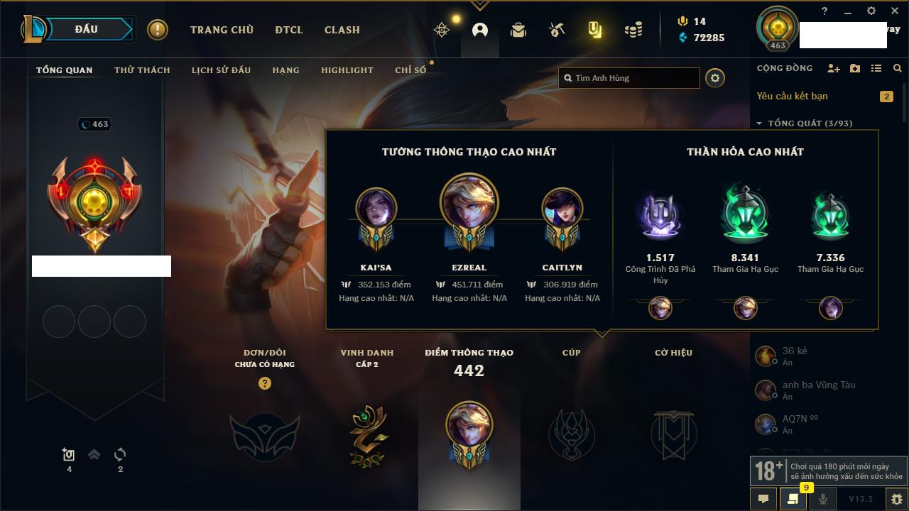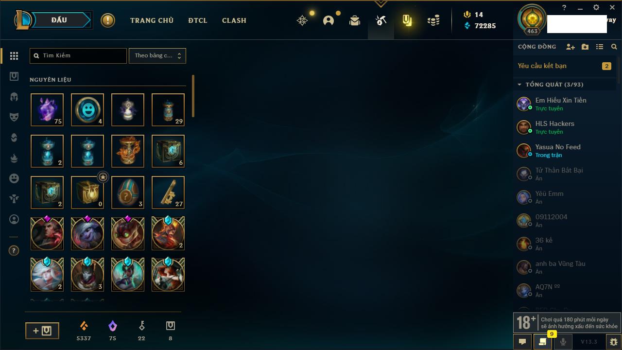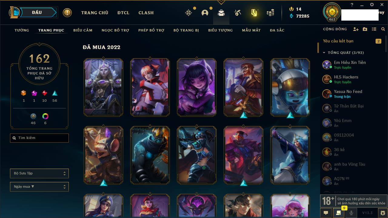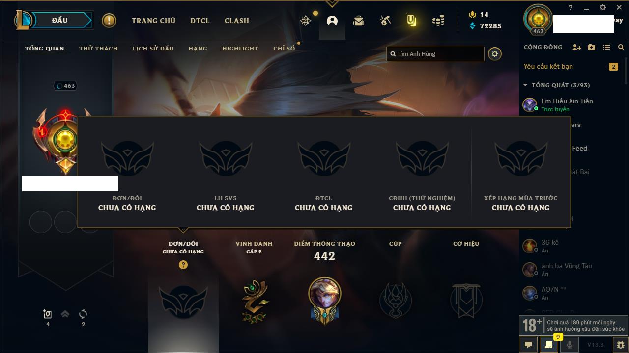 Rank Đơn: Chưa RankKhung: Chưa có khungTướng: 165 - Còn 3214 THXTrang Phục: 160Rank ĐTCL: Chưa RankLinh Thú: 28