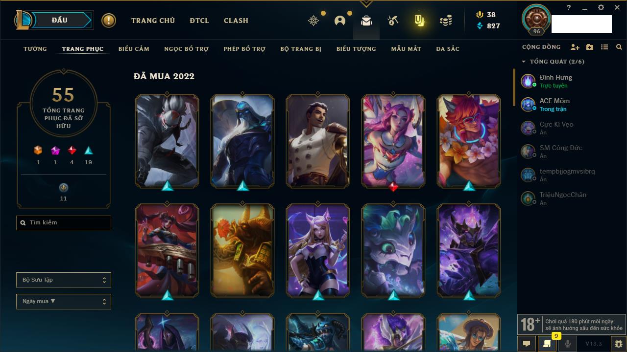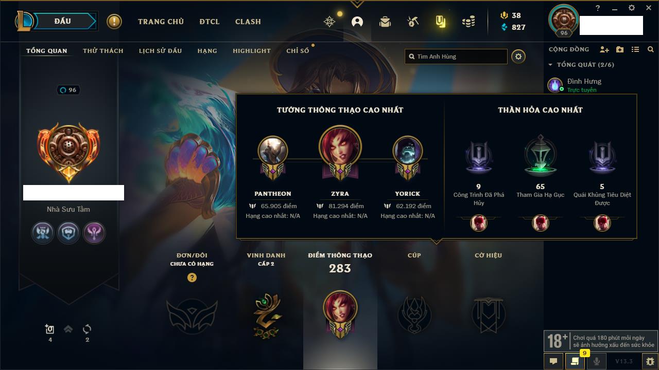 Rank Đơn: Vàng IVKhung: VàngTướng: 171 - Còn 48721 THXTrang Phục: 171Rank ĐTCL: Chưa RankLinh Thú: 27
