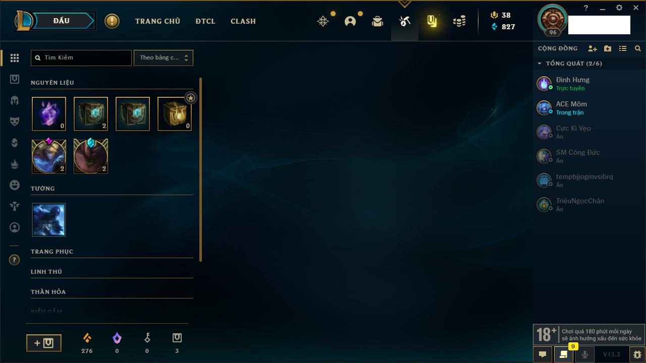 Rank Đơn: Bạc IVKhung: VàngTướng: 172 - Còn 358384 THXTrang Phục: 177Rank ĐTCL: Lục Bảo IILinh Thú: 211