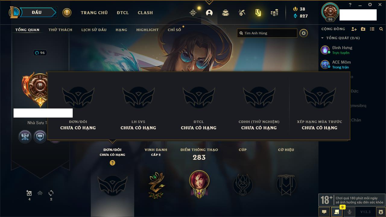 Rank Đơn: Vàng IVKhung: BạcTướng: 166 - Còn 180925 THXTrang Phục: 163Rank ĐTCL: Chưa RankLinh Thú: 67
