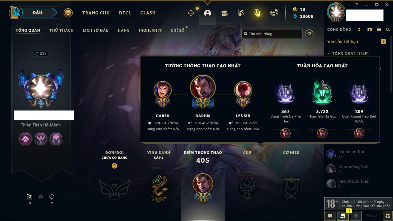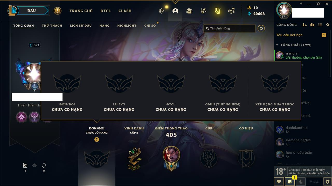Rank Đơn: Bạch Kim IVKhung: Bạch kimTướng: 171 - Còn 182788 THXTrang Phục: 158Rank ĐTCL: Lục Bảo IVLinh Thú: 56