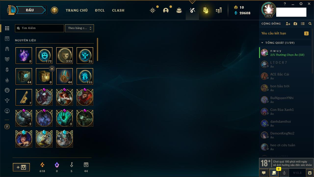 Rank Đơn: Bạch Kim IIIKhung: Bạch kimTướng: 170 - Còn 61079 THXTrang Phục: 352Rank ĐTCL: Sắt IILinh Thú: 70