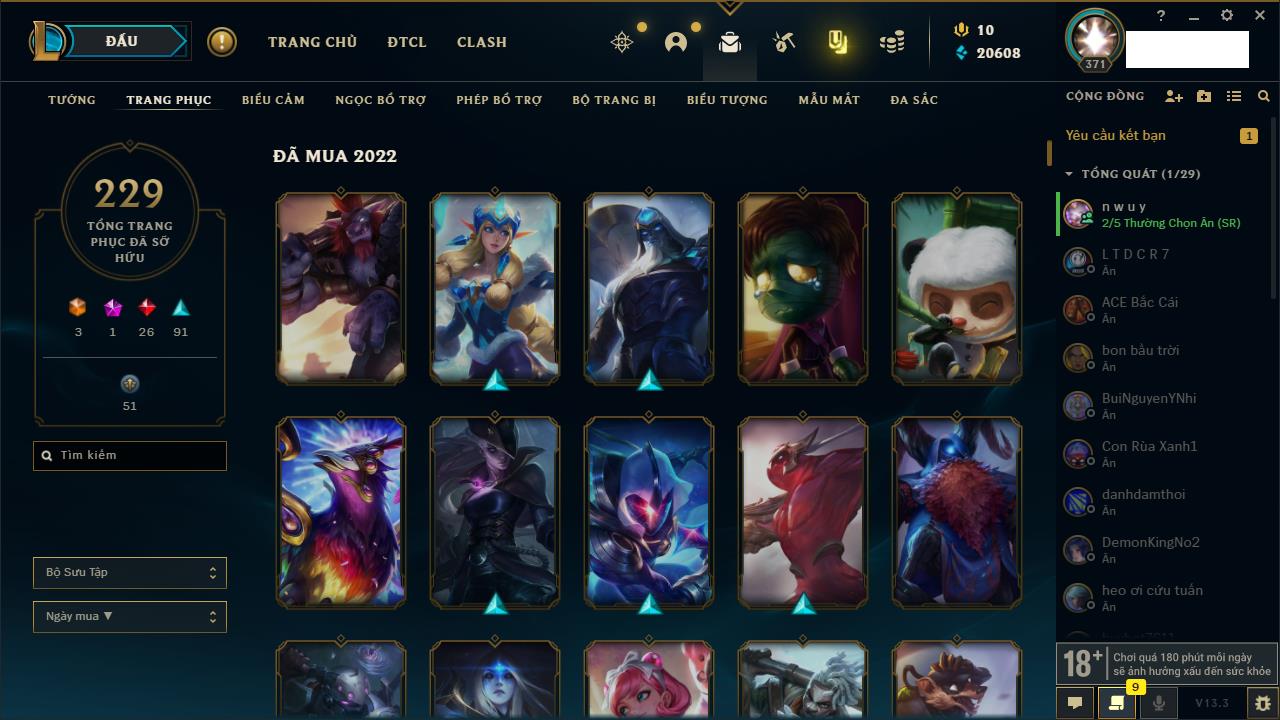Rank Đơn: Vàng IKhung: Bạch kimTướng: 170 - Còn 212450 THXTrang Phục: 214Rank ĐTCL: Bạch Kim IVLinh Thú: 221