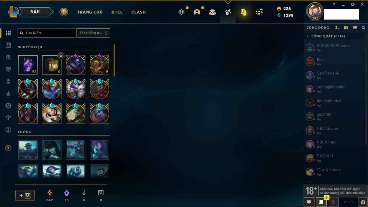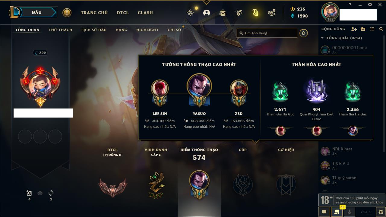 Rank Đơn: Bạch Kim IIIKhung: Bạch kimTướng: 171 - Còn 210697 THXTrang Phục: 220Rank ĐTCL: Bạc IVLinh Thú: 51
