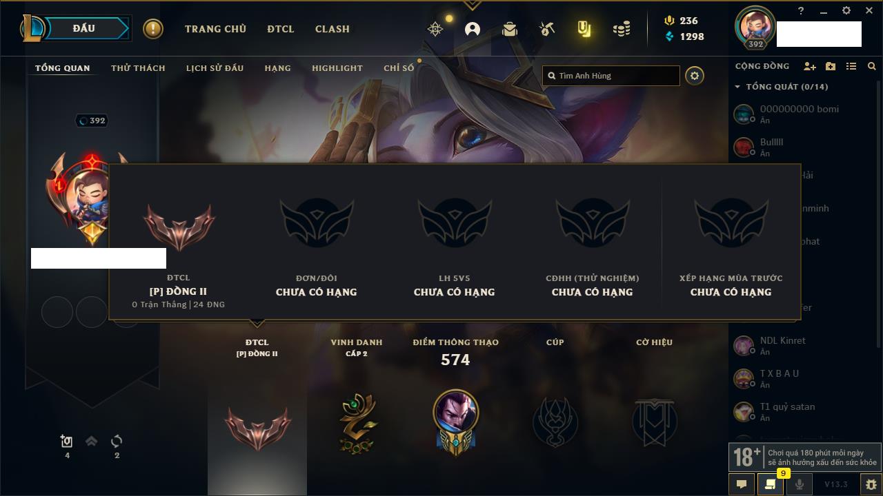 Rank Đơn: Đồng IIKhung: ĐồngTướng: 170 - Còn 6396 THXTrang Phục: 113Rank ĐTCL: Chưa RankLinh Thú: 118