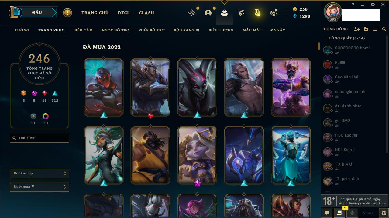 Rank Đơn: Bạch Kim IVKhung: Bạch kimTướng: 171 - Còn 218930 THXTrang Phục: 162Rank ĐTCL: Chưa RankLinh Thú: 118