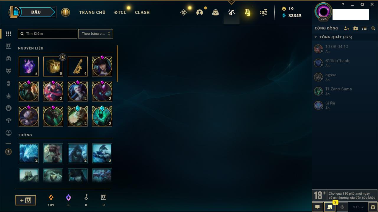 Rank Đơn: Bạch Kim IVKhung: Bạch kimTướng: 171 - Còn 182788 THXTrang Phục: 158Rank ĐTCL: Lục Bảo IVLinh Thú: 56