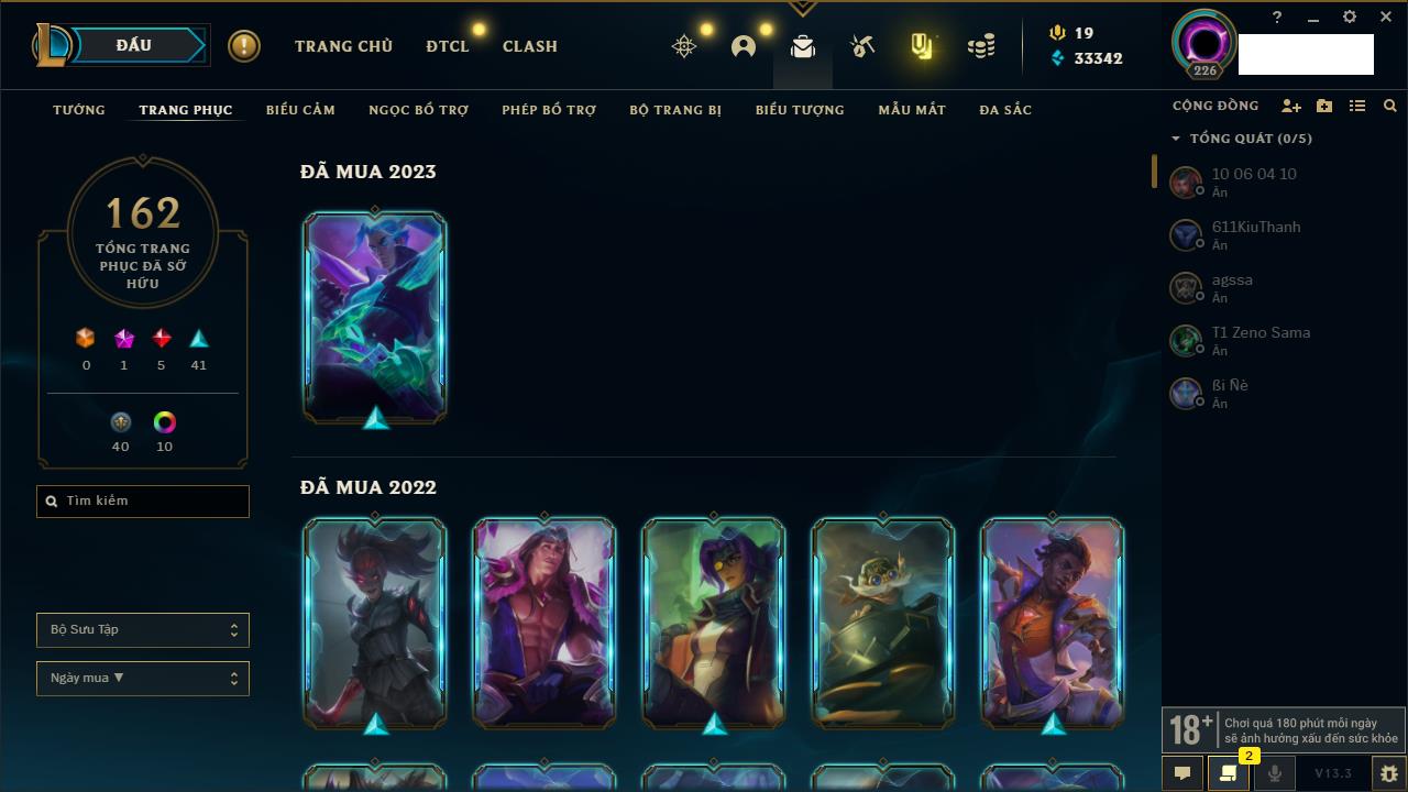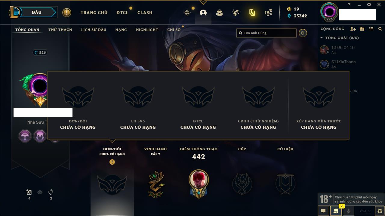 Rank Đơn: Đồng IIIKhung: ĐồngTướng: 170 - Còn 48082 THXTrang Phục: 272Rank ĐTCL: Chưa RankLinh Thú: 84