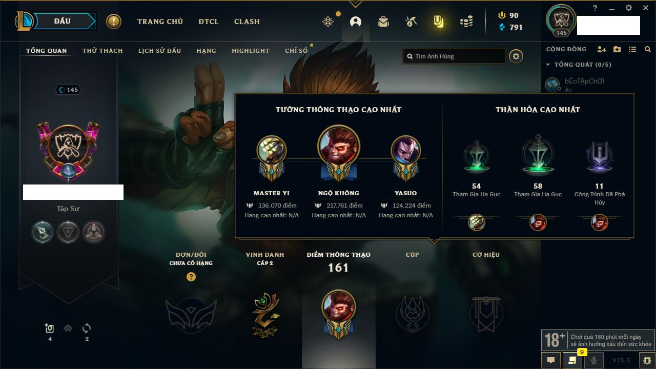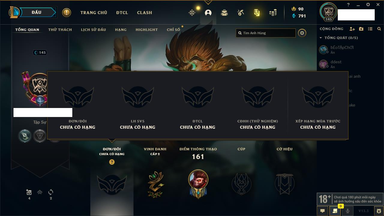 Rank Đơn: Bạc IIIKhung: Chưa có khungTướng: 171 - Còn 21493 THXTrang Phục: 252Rank ĐTCL: Bạch Kim IVLinh Thú: 123