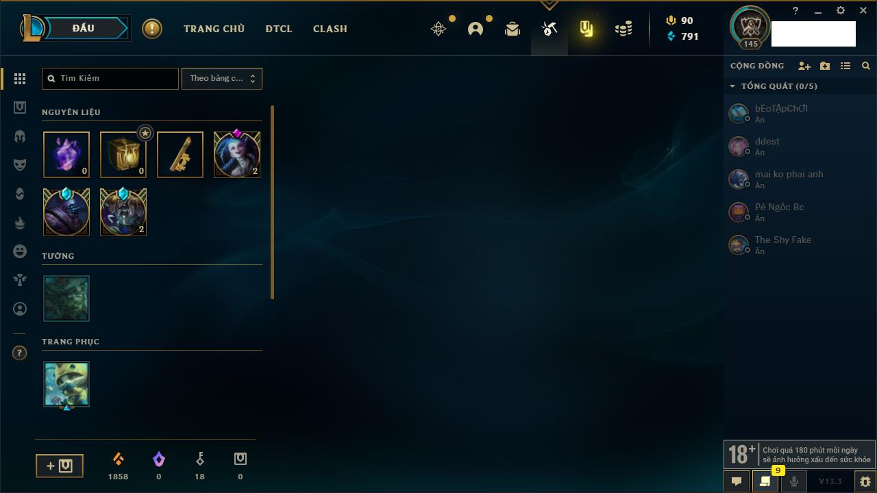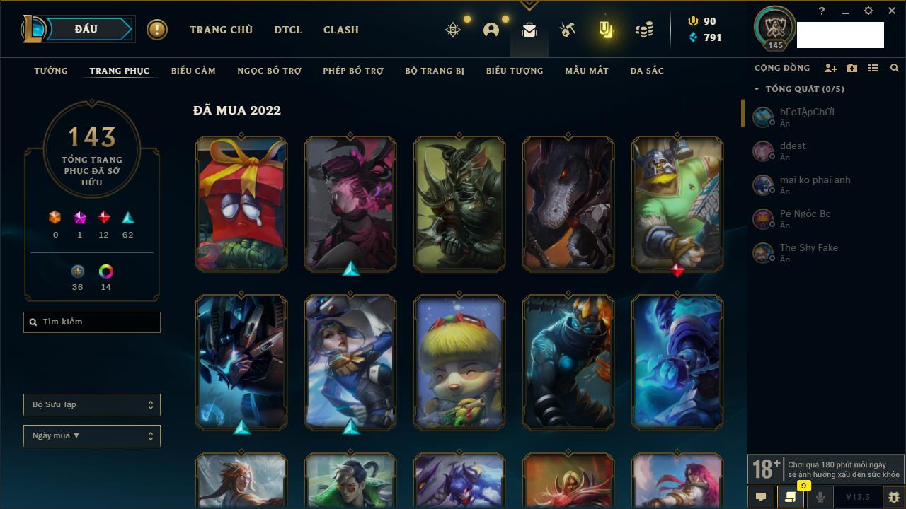 Rank Đơn: Vàng IIKhung: VàngTướng: 171 - Còn 34018 THXTrang Phục: 250Rank ĐTCL: Sắt IILinh Thú: 19