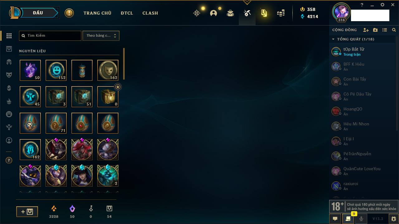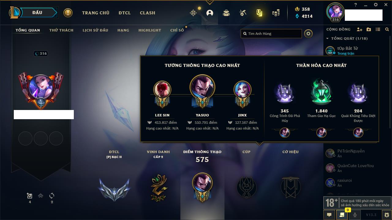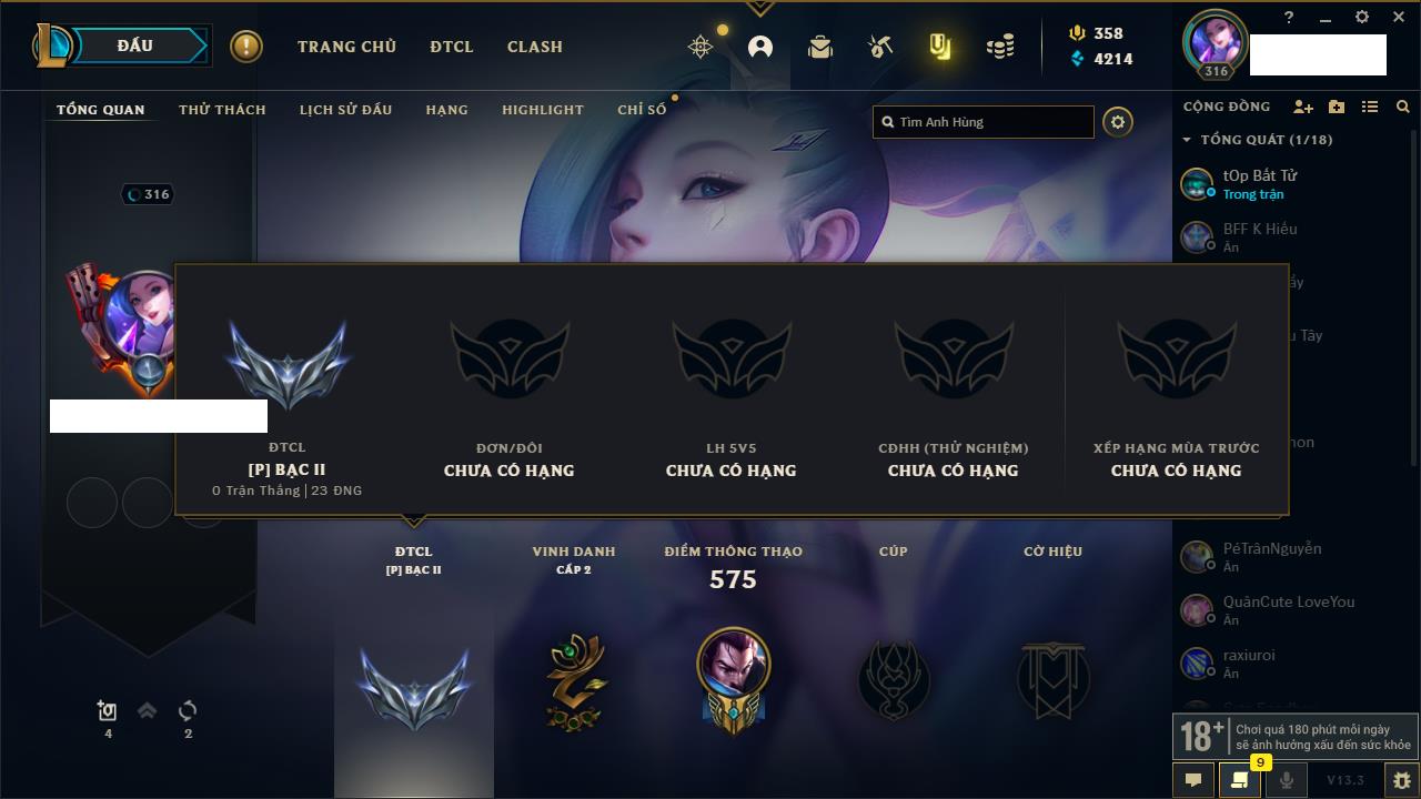 Rank Đơn: Bạc IIIKhung: Chưa có khungTướng: 171 - Còn 21493 THXTrang Phục: 252Rank ĐTCL: Bạch Kim IVLinh Thú: 123