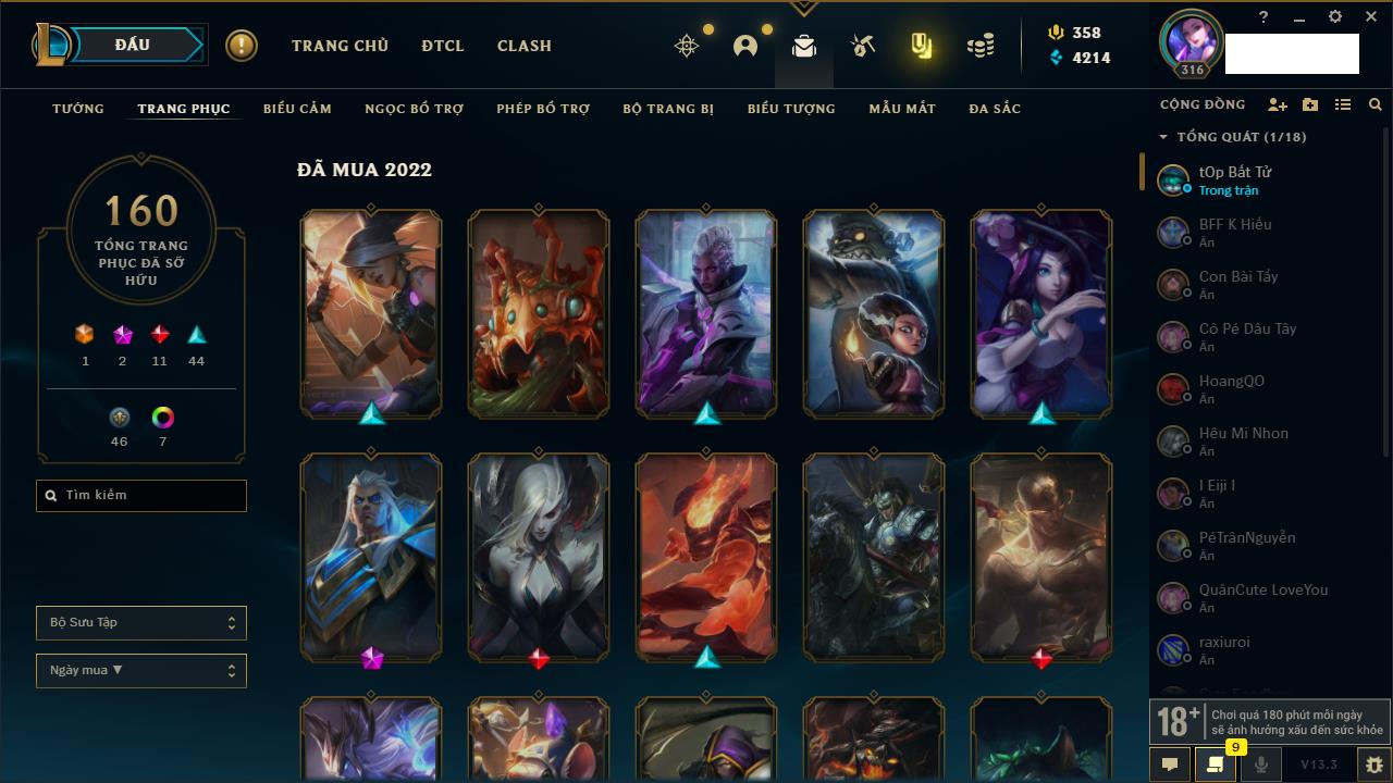 Rank Đơn: Vàng IIIKhung: VàngTướng: 161 - Còn 162202 THXTrang Phục: 179Rank ĐTCL: Chưa RankLinh Thú: 20