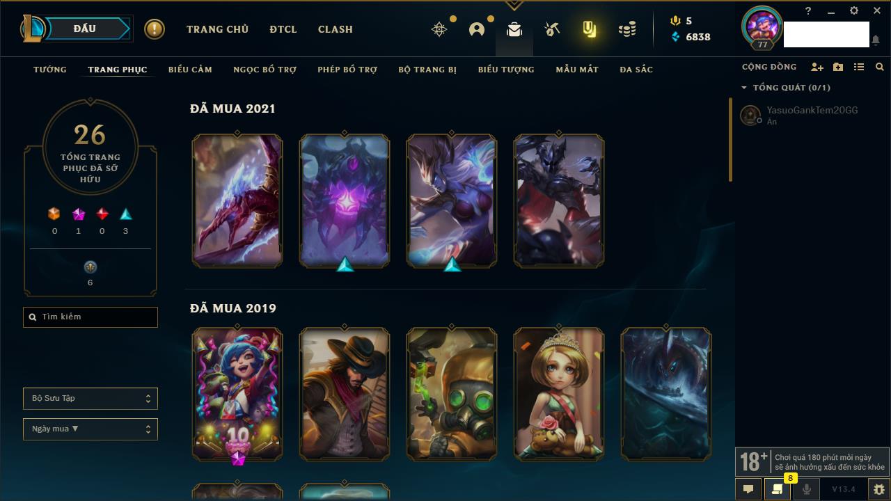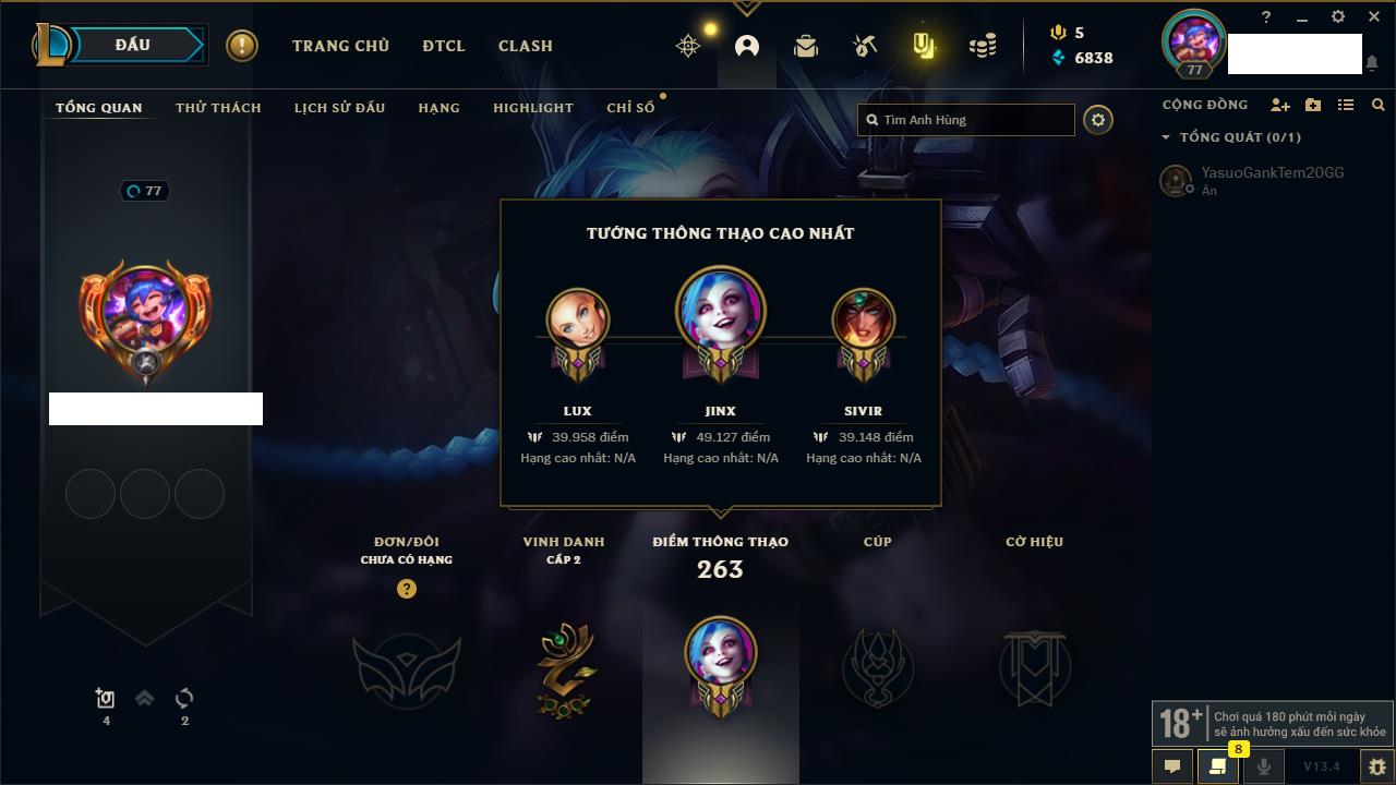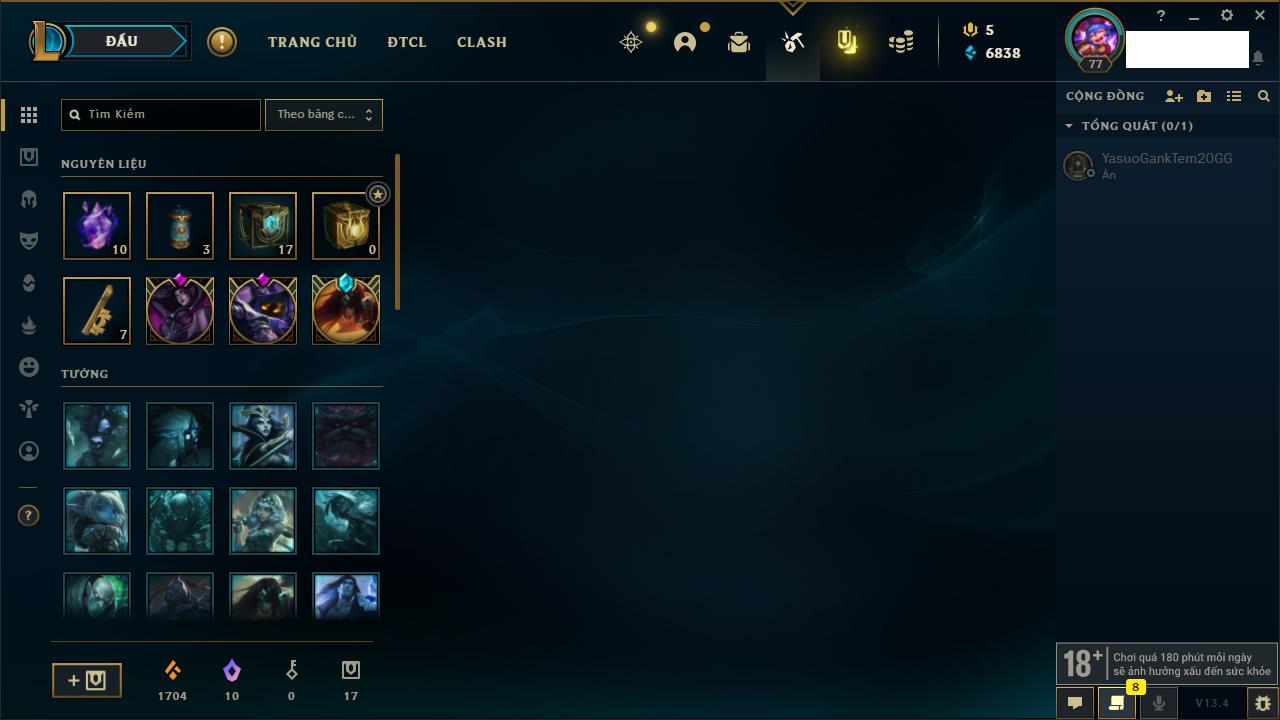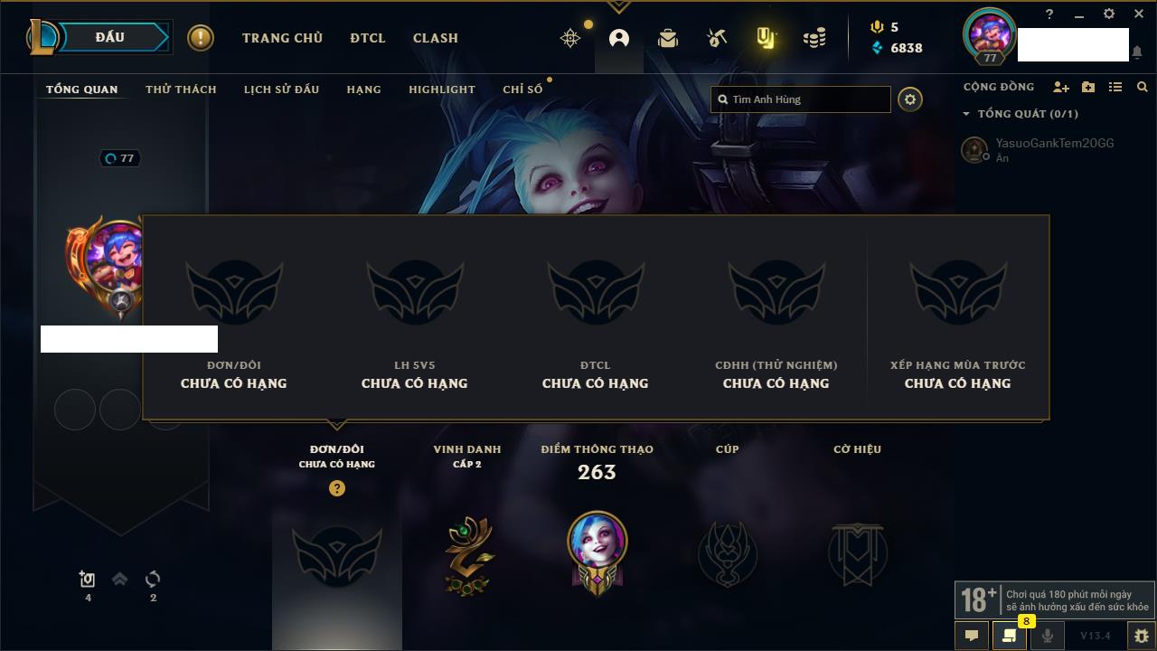 Rank Đơn: Vàng IKhung: BạcTướng: 171 - Còn 60584 THXTrang Phục: 286Rank ĐTCL: Vàng IIILinh Thú: 117