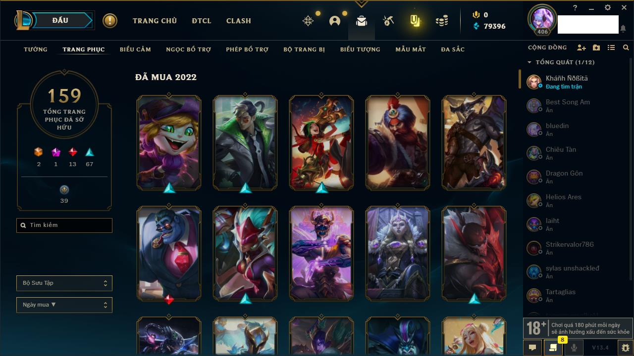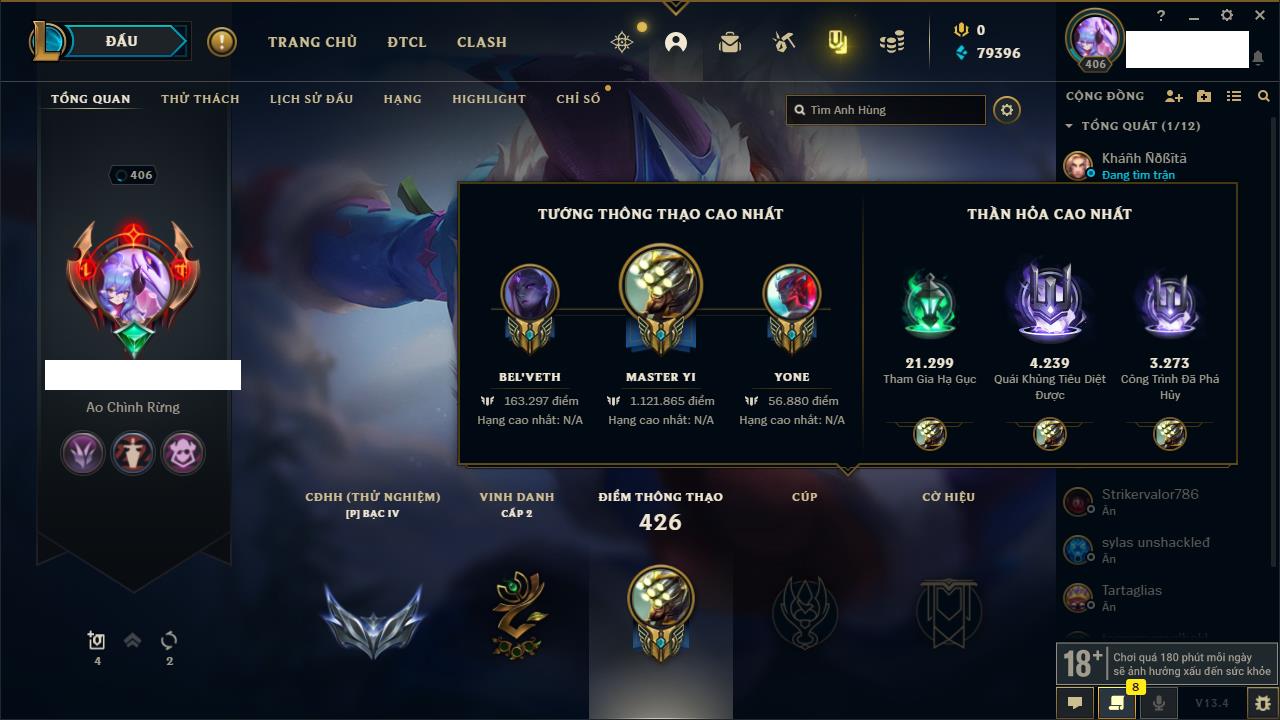 Rank Đơn: Vàng IIIKhung: BạcTướng: 171 - Còn 101359 THXTrang Phục: 88Rank ĐTCL: Kim Cương IVLinh Thú: 200