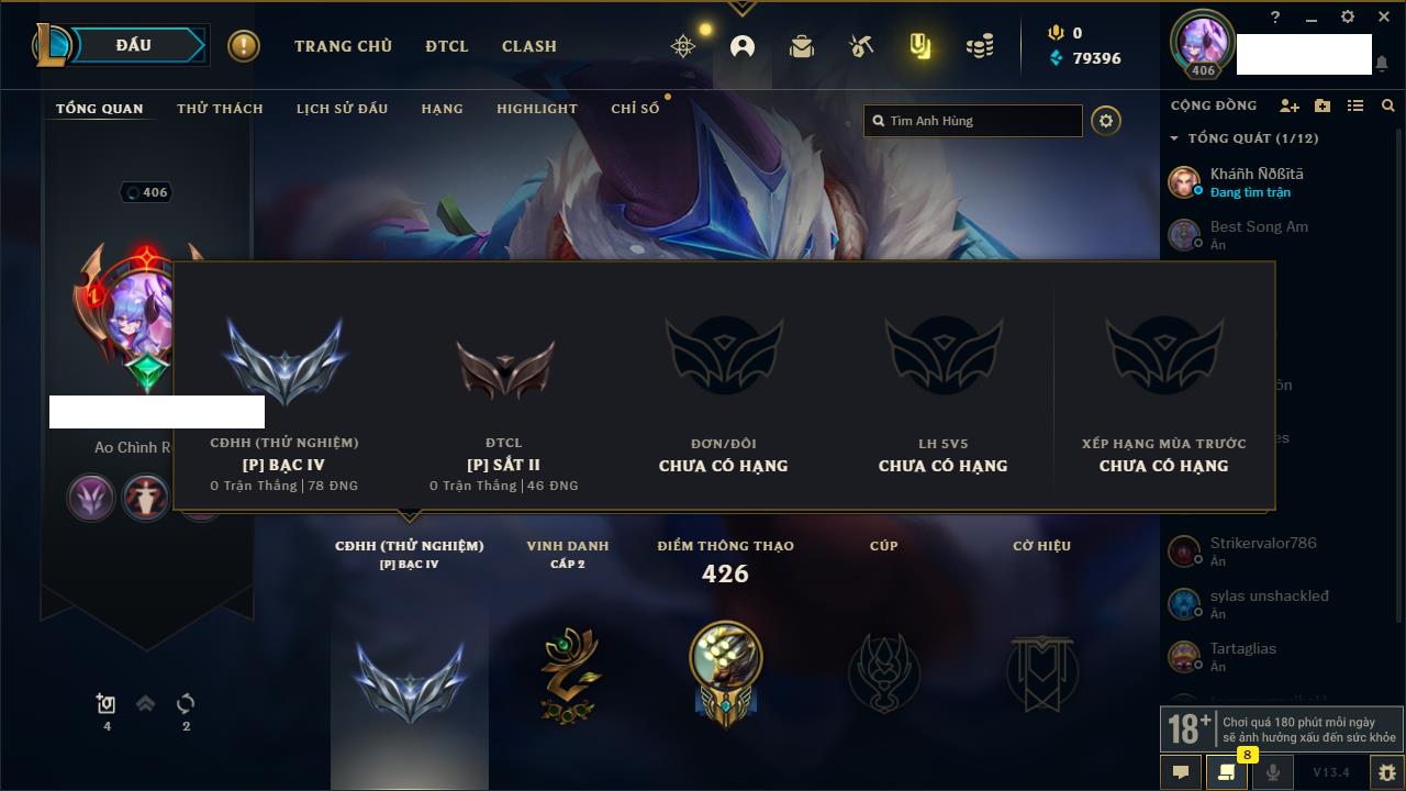 Rank Đơn: Lục Bảo IVKhung: Bạch kimTướng: 171 - Còn 128452 THXTrang Phục: 193Rank ĐTCL: Bạc IIILinh Thú: 100