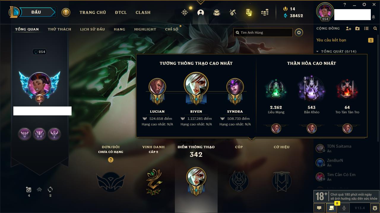 Rank Đơn: Lục Bảo IVKhung: Bạch kimTướng: 171 - Còn 128452 THXTrang Phục: 193Rank ĐTCL: Bạc IIILinh Thú: 100