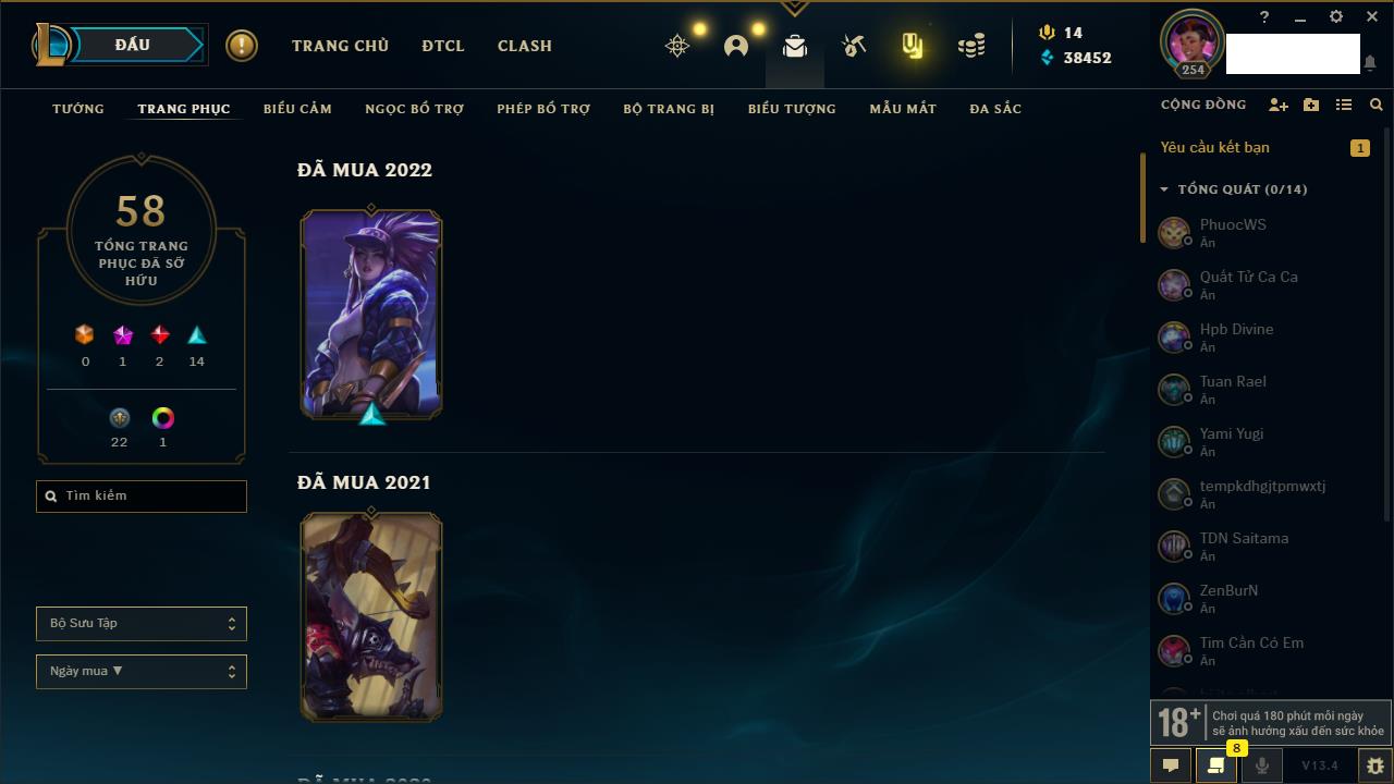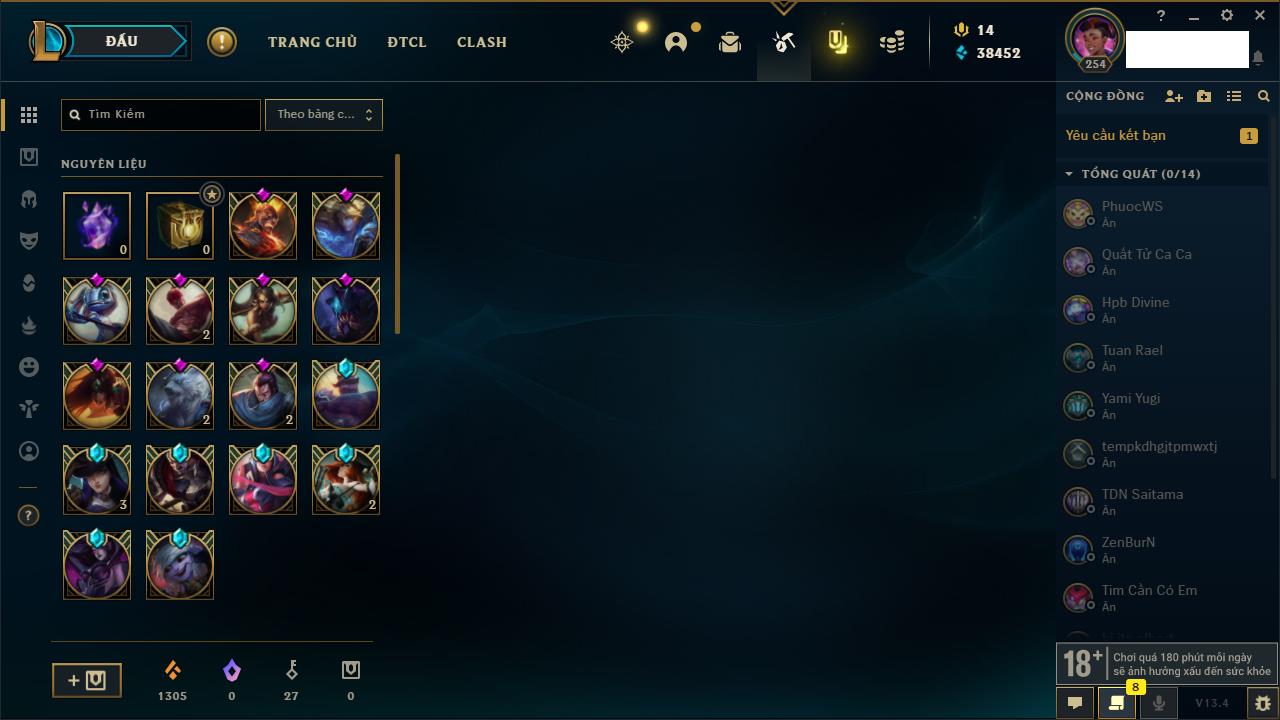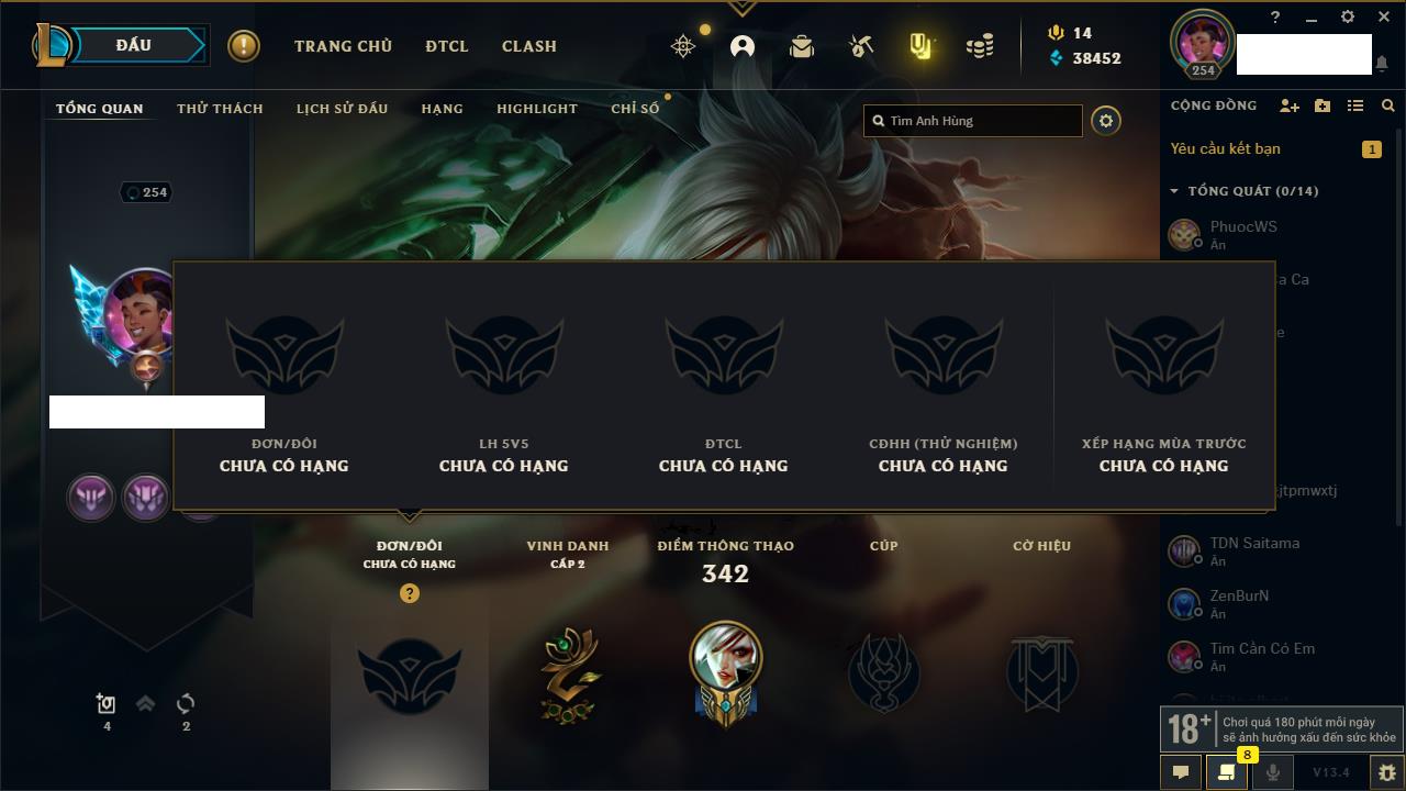 Rank Đơn: Vàng IIIKhung: BạcTướng: 171 - Còn 101359 THXTrang Phục: 88Rank ĐTCL: Kim Cương IVLinh Thú: 200