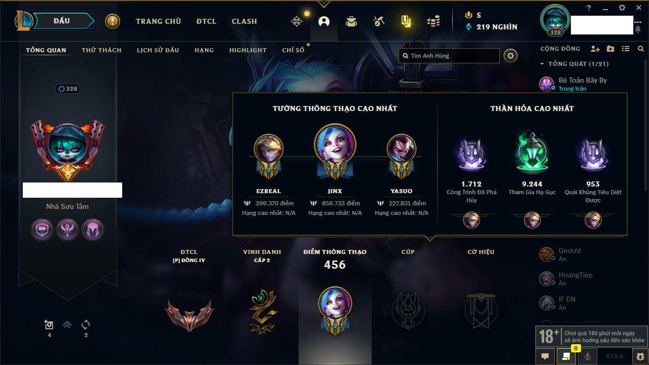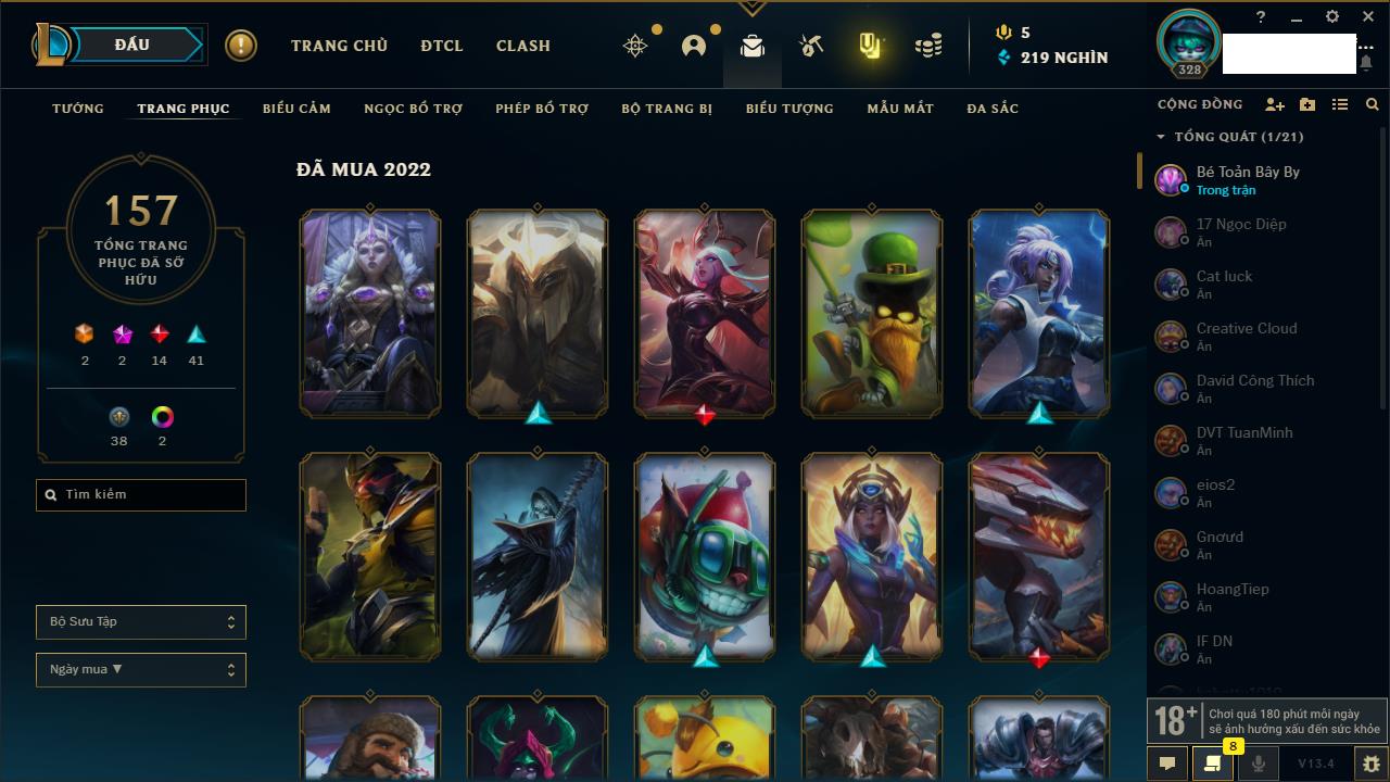 Rank Đơn: Chưa RankKhung: Chưa có khungTướng: 157 - Còn 6783 THXTrang Phục: 50Rank ĐTCL: Chưa RankLinh Thú: 37