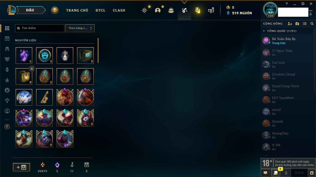 Rank Đơn: Đồng IIKhung: Chưa có khungTướng: 170 - Còn 56487 THXTrang Phục: 90Rank ĐTCL: Chưa RankLinh Thú: 129