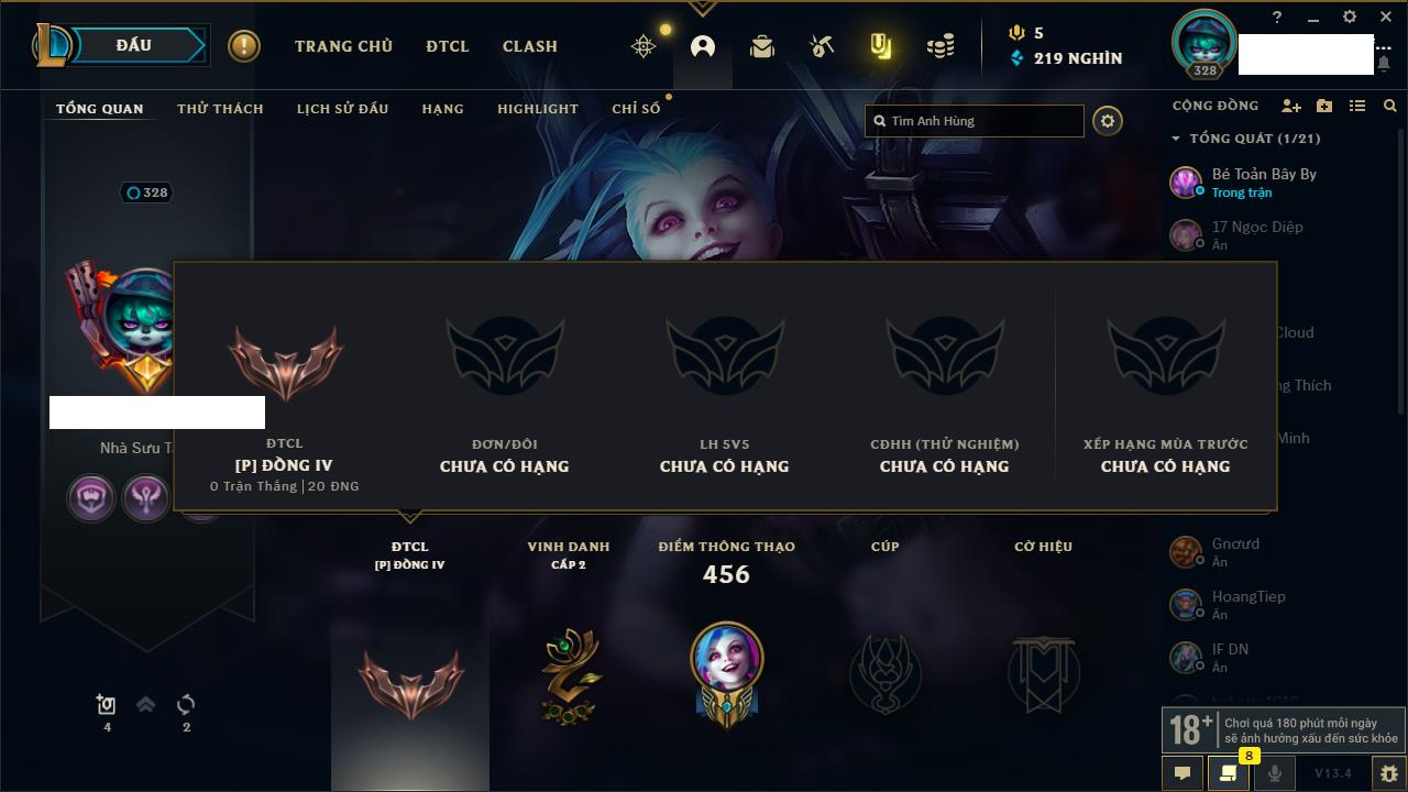 Rank Đơn: Vàng IVKhung: VàngTướng: 146 - Còn 89110 THXTrang Phục: 63Rank ĐTCL: Vàng IIILinh Thú: 41