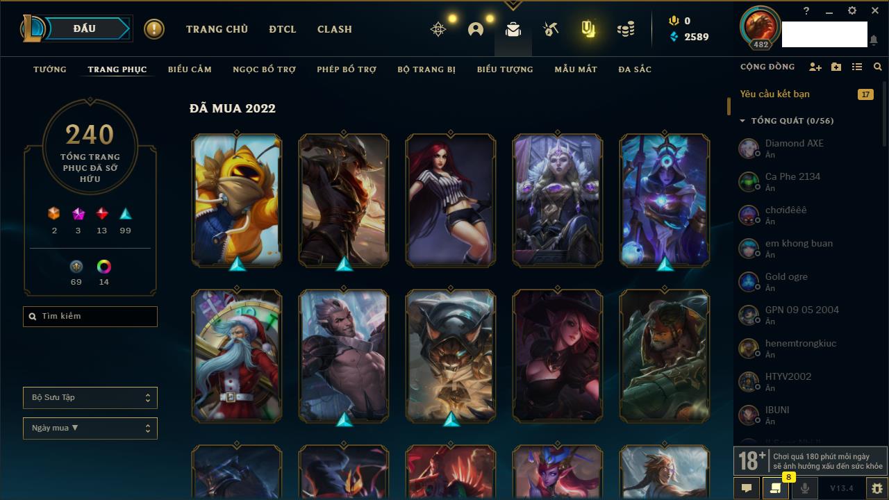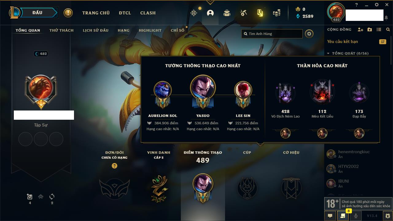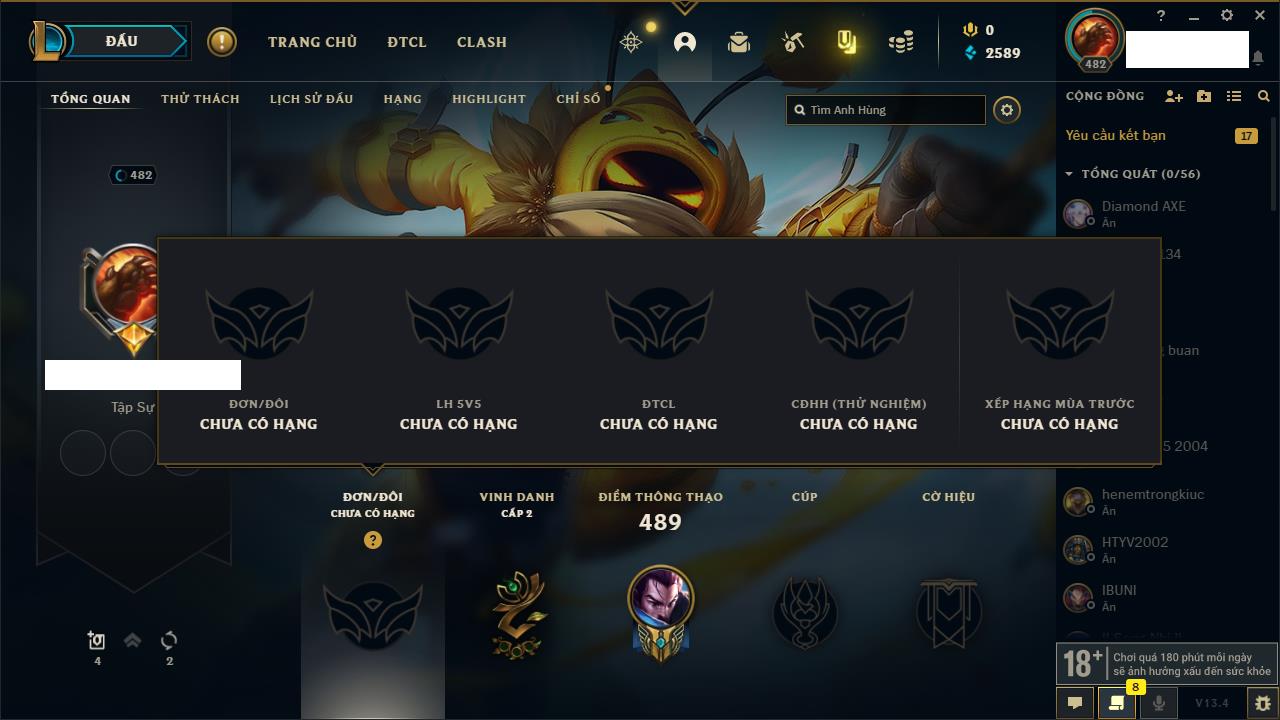 Rank Đơn: Đồng IKhung: ĐồngTướng: 168 - Còn 11447 THXTrang Phục: 245Rank ĐTCL: Chưa RankLinh Thú: 53