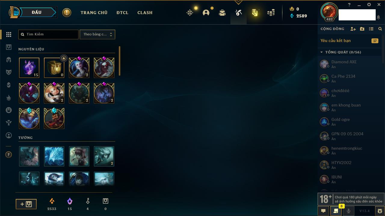 Rank Đơn: Vàng IIIKhung: BạcTướng: 171 - Còn 101359 THXTrang Phục: 88Rank ĐTCL: Kim Cương IVLinh Thú: 200
