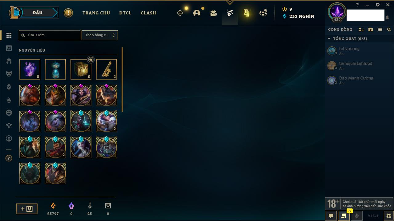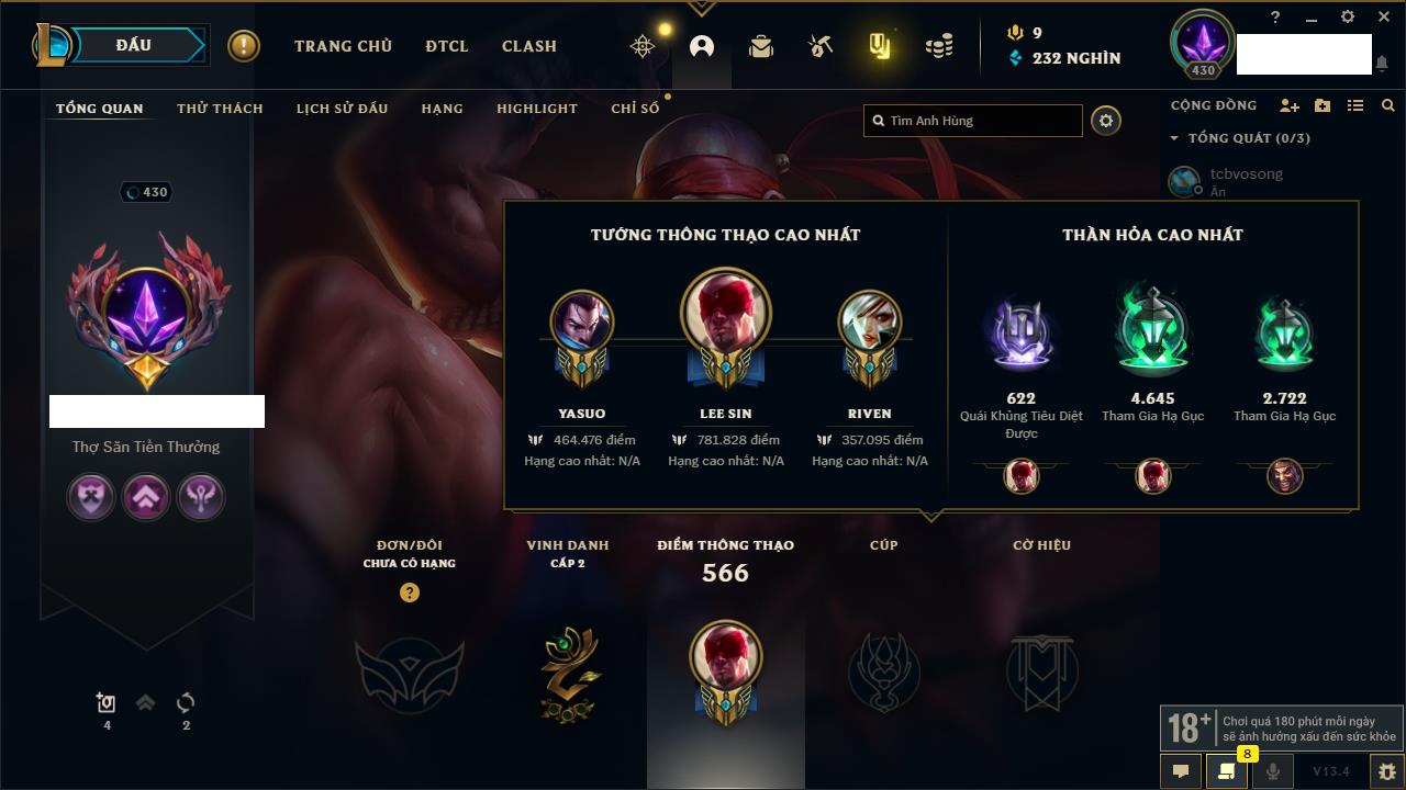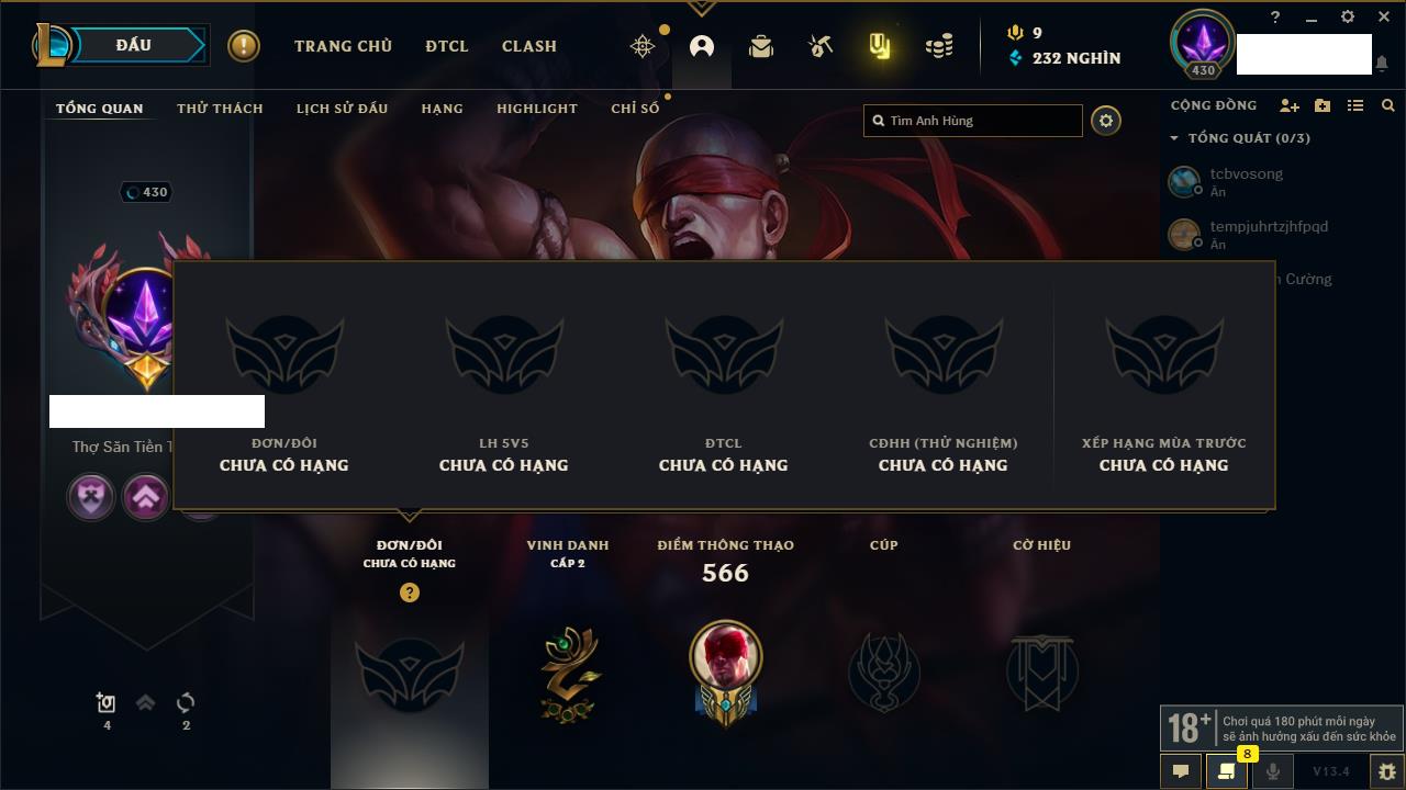 Rank Đơn: Chưa RankKhung: Chưa có khungTướng: 157 - Còn 6783 THXTrang Phục: 50Rank ĐTCL: Chưa RankLinh Thú: 37