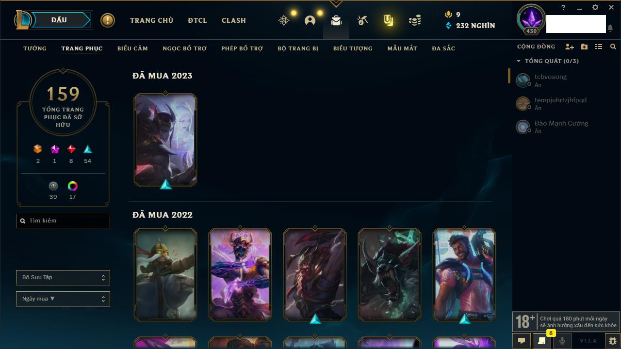 Rank Đơn: Vàng IIIKhung: VàngTướng: 170 - Còn 33222 THXTrang Phục: 136Rank ĐTCL: Chưa RankLinh Thú: 40