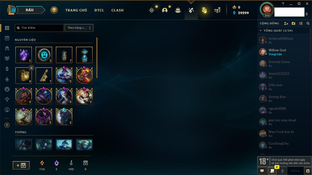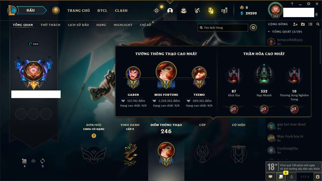 Rank Đơn: Bạc IIIKhung: Chưa có khungTướng: 171 - Còn 21493 THXTrang Phục: 252Rank ĐTCL: Bạch Kim IVLinh Thú: 123