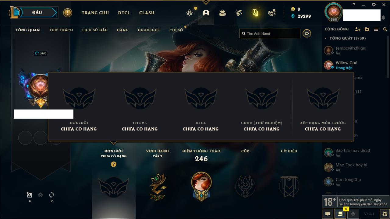 Rank Đơn: Vàng IIKhung: VàngTướng: 171 - Còn 34018 THXTrang Phục: 250Rank ĐTCL: Sắt IILinh Thú: 19