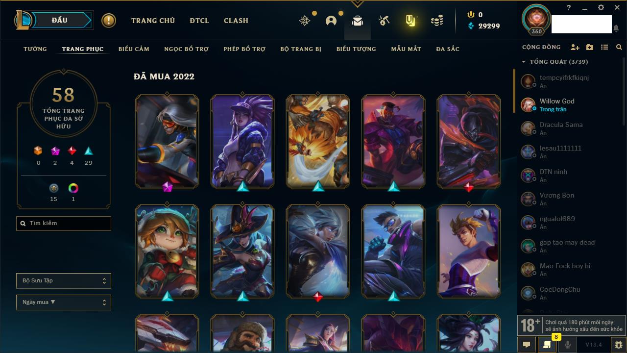 Rank Đơn: Vàng IIIKhung: VàngTướng: 161 - Còn 162202 THXTrang Phục: 179Rank ĐTCL: Chưa RankLinh Thú: 20